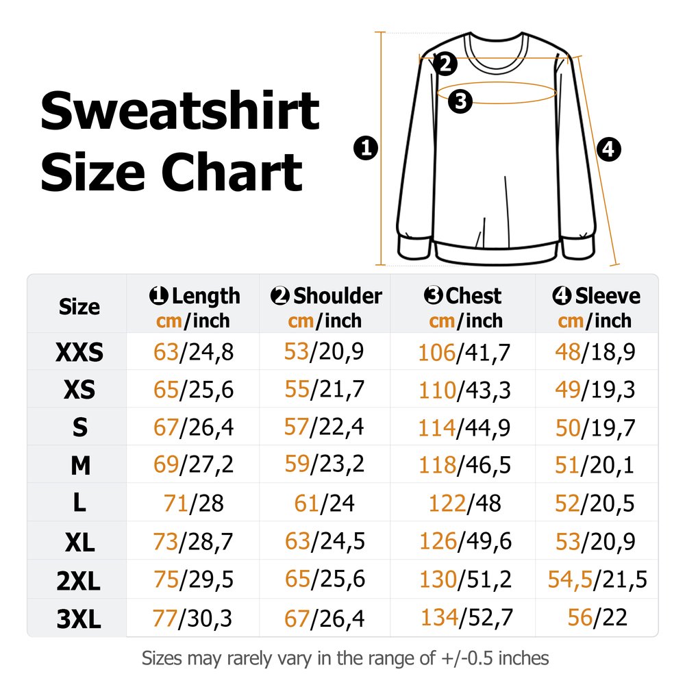 | Measurement: | T-shirt - XXS, XS, S, M, L, XL, 2XL, 3XL, 4XL, 5XL Sweatshirt - XXS, XS, S, M, L, XL, 2XL, 3XL |