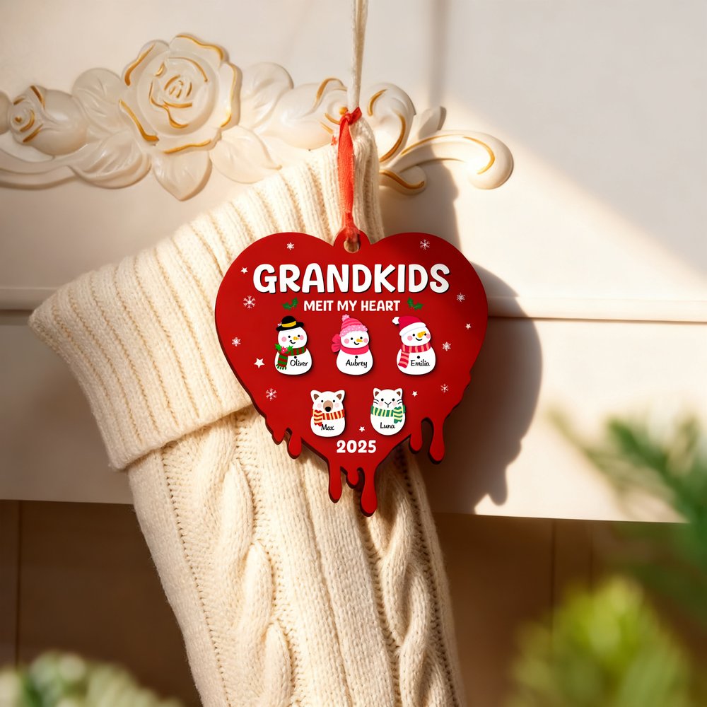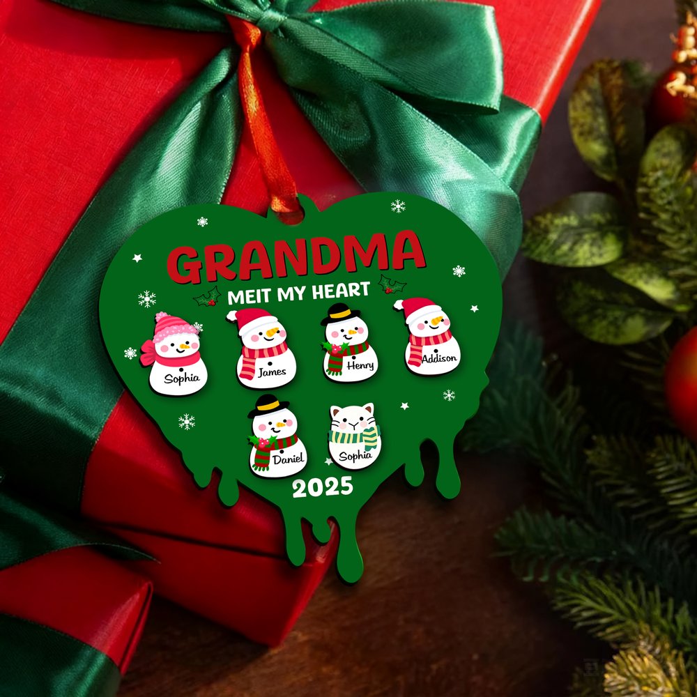 This Christmas ornament or fridge magnet features a snowman family and heart theme, offering five different snowman styles to choose from. Each snowman wears a different hat and scarf, and as falling snowflakes, it creates a strong Christmas atmosphere. You can give each snowman a custom name, give the ornament or fridge magnet along with a custom nickname, a commemorative year, and a text of blessing to record warm family moments.