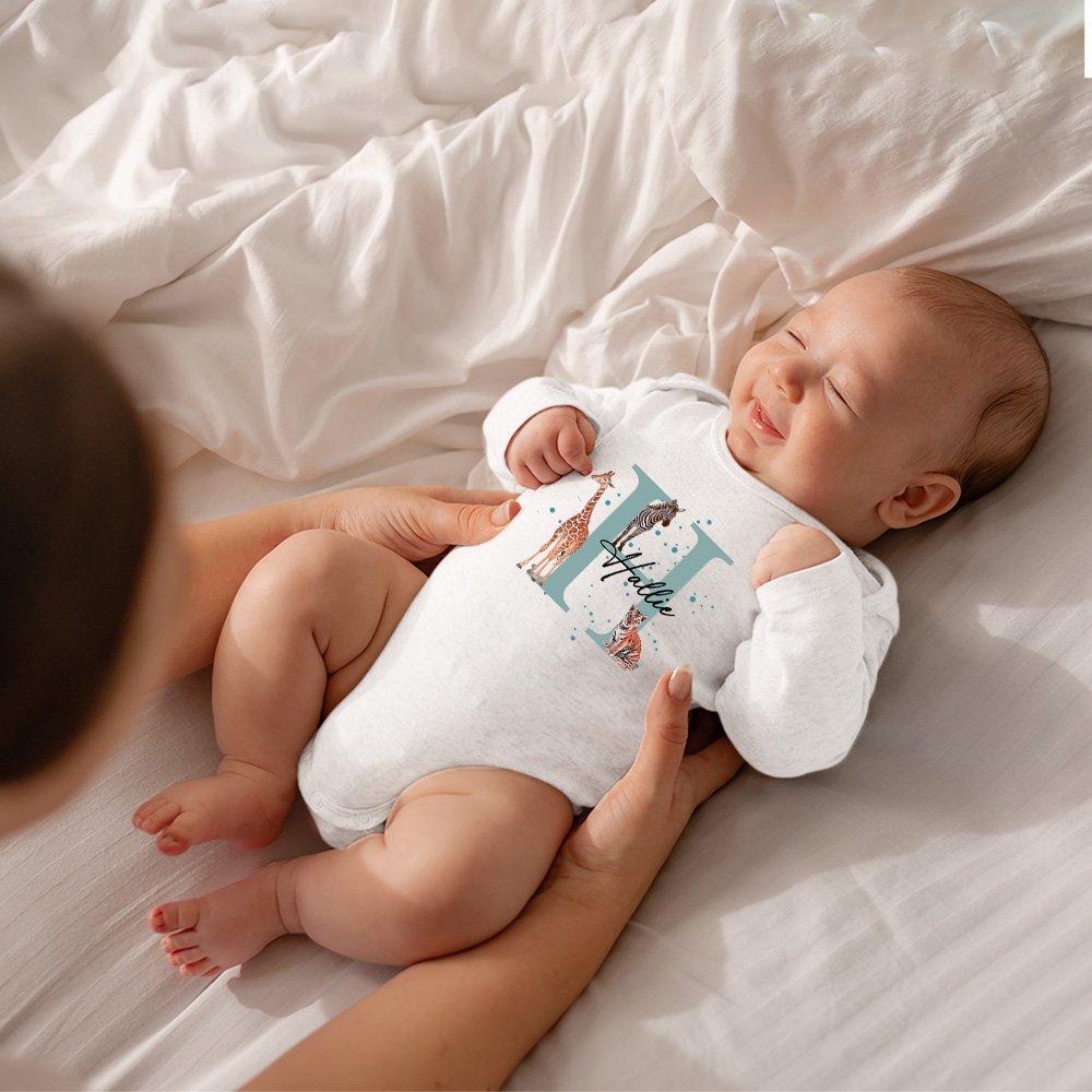 The onesie features adorable prints of friendly jungle animals, such as lions, elephants, and giraffes. In addition to the vibrant colors and charming designs, the outfit is versatile, making it perfect for photo opportunities and everyday wear. You can customize its name; personalizing it creates a keepsake that will be treasured forever.