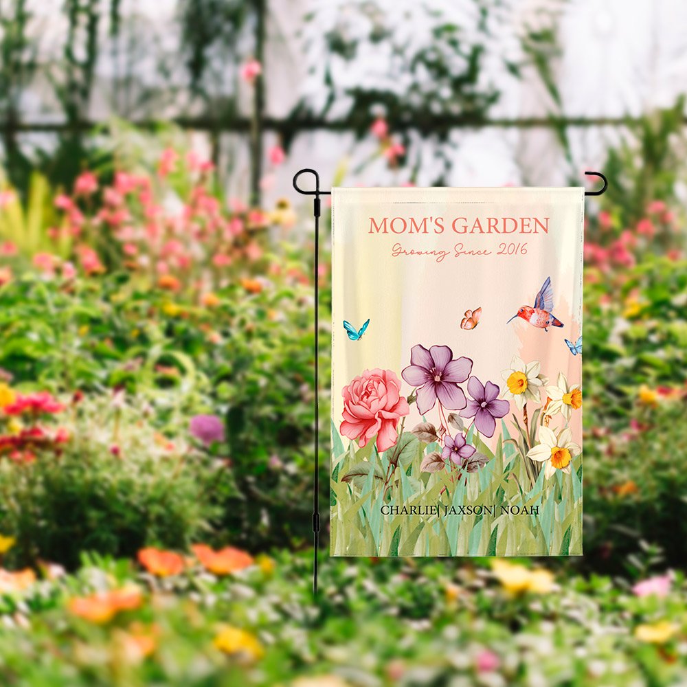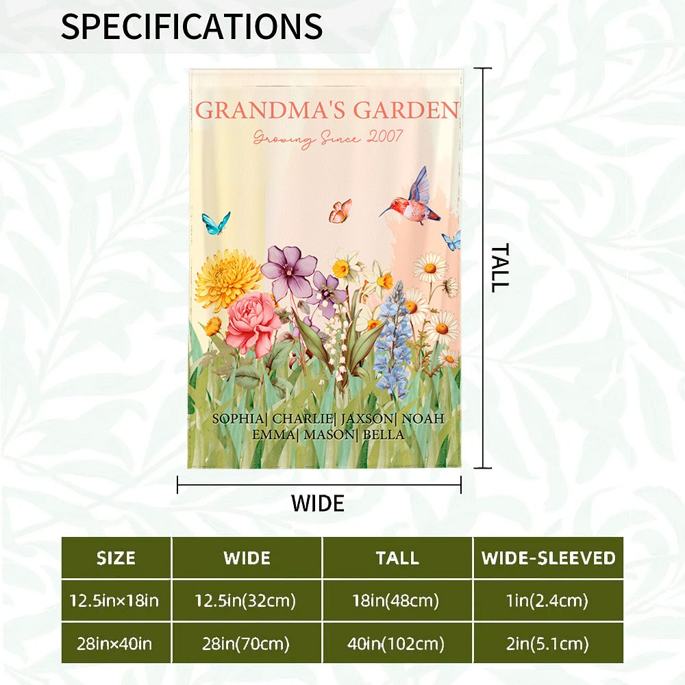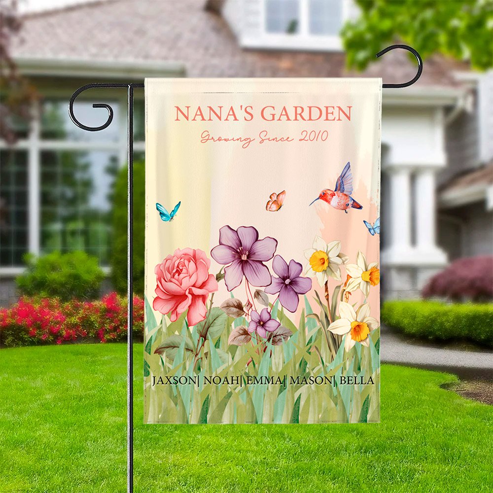 This garden flag features a soft and fresh pink backdrop adorned with fluttering butterflies and hummingbirds, evoking a heartwarming charm. Customize it with 2-15 birth flowers, each carrying a unique symbolism, paired with your family members’ names, perfectly capturing the bond and love within your household. The phrases 'GRANDMA'S GARDEN' and 'Growing Since 2007' can be customized, symbolizing a lovingly nurtured garden of family happiness.