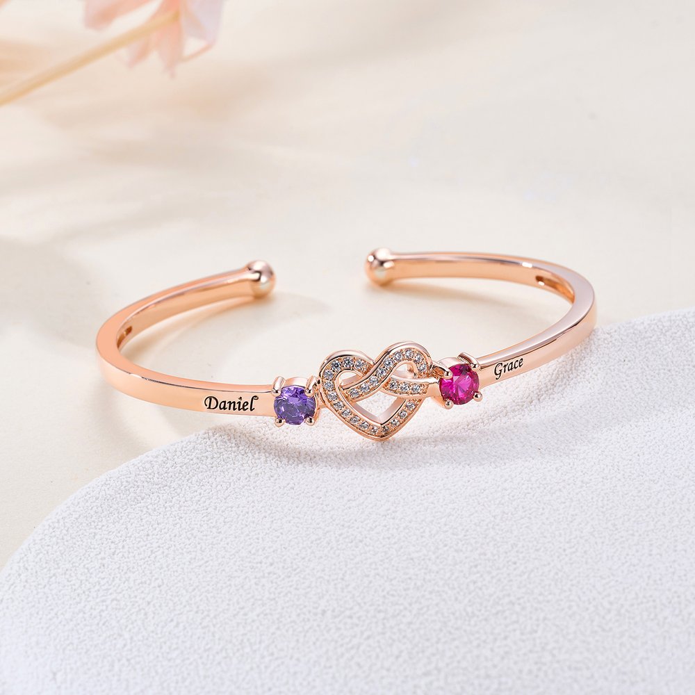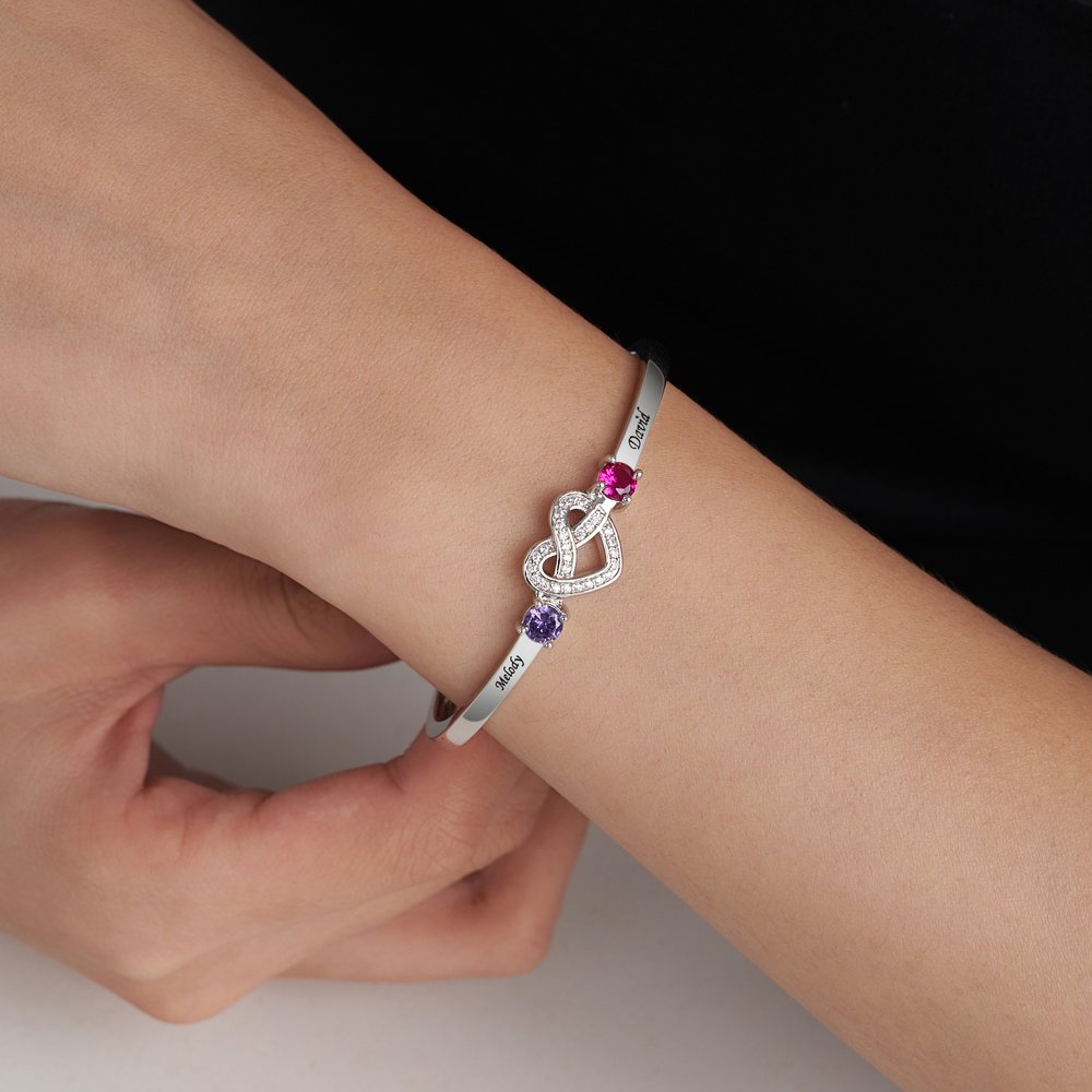 Our bracelet features a central love knot design, symbolizing the eternal bond between you and your beloved. Its elegant and stunning appearance showcases a unique charm. Flanking the heart are two birthstones, each representing the birth months of you and your loved one. You can also add your and your partner's names, making this bracelet a truly one-of-a-kind piece that carries your special memories together.