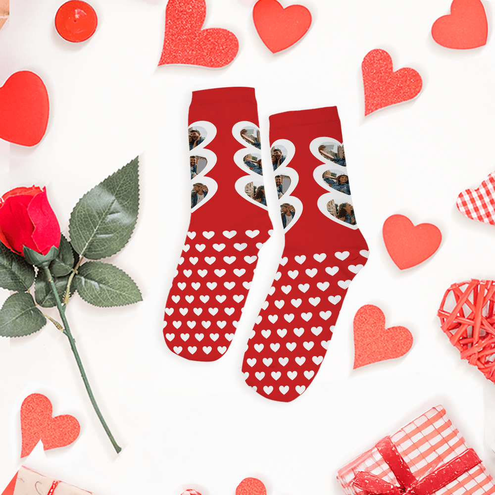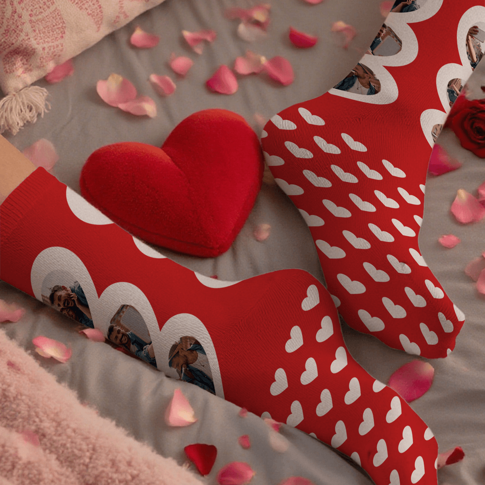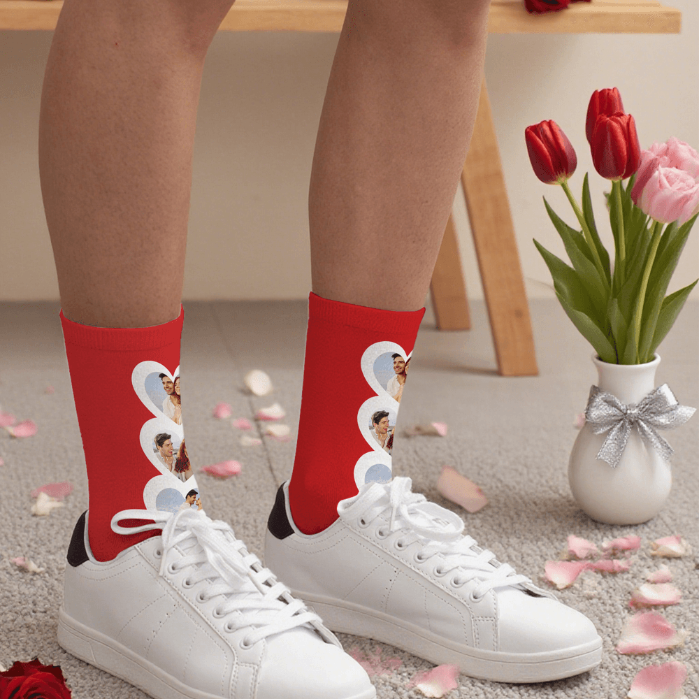 These socks feature red as the primary color, symbolizing passionate love and romance. The bottom of the socks is decorated with neatly arranged white hearts. Up to three couple photos can be added to create a heart-shaped pattern, allowing you to wear your sweetest memories on your feet, silently expressing your love. Whether it's a photo from your first date or a sweet moment from a trip, these socks can be perfectly preserved and transformed into a special "memento of love."