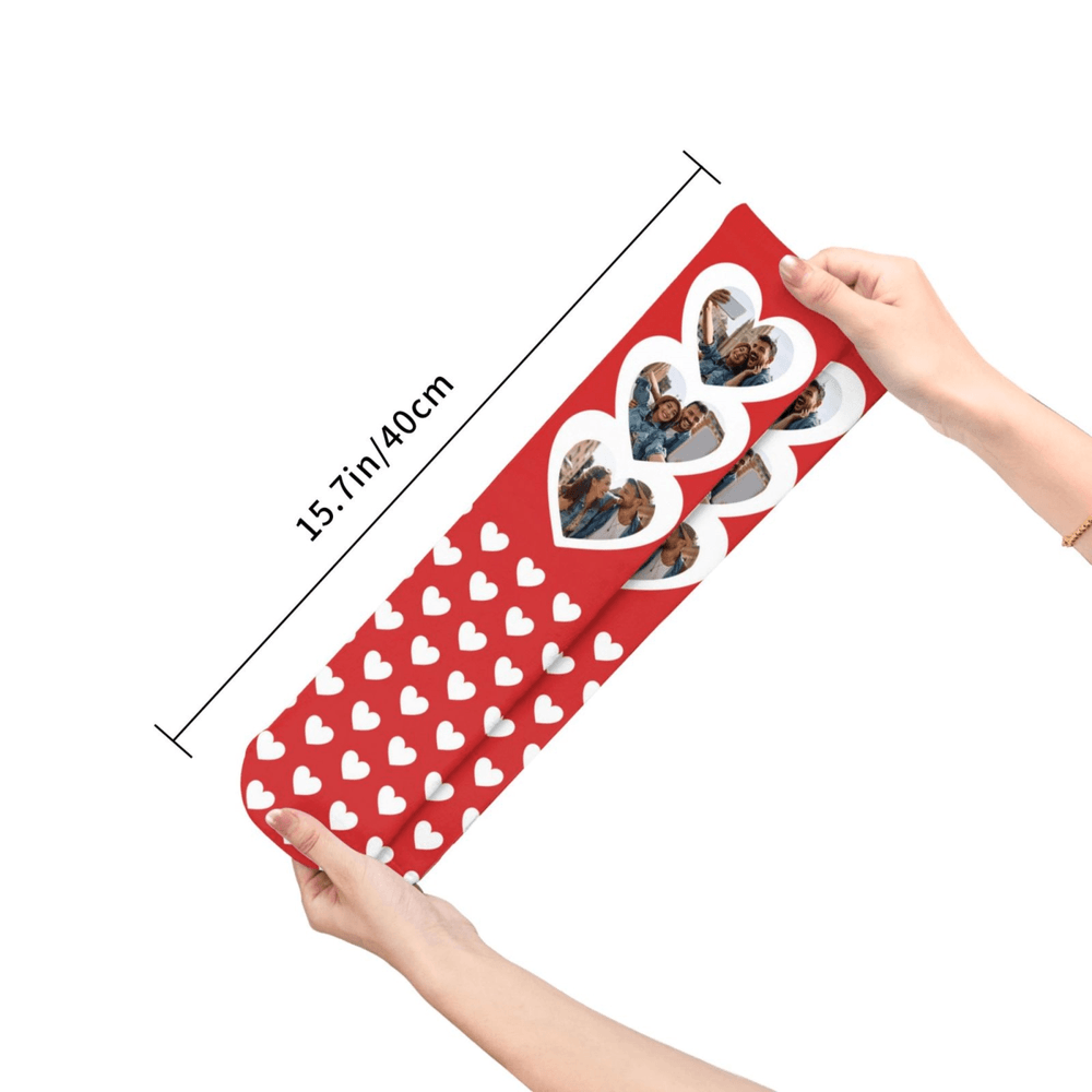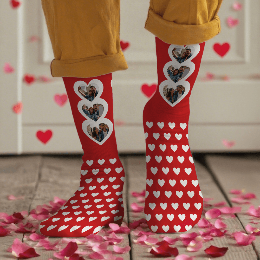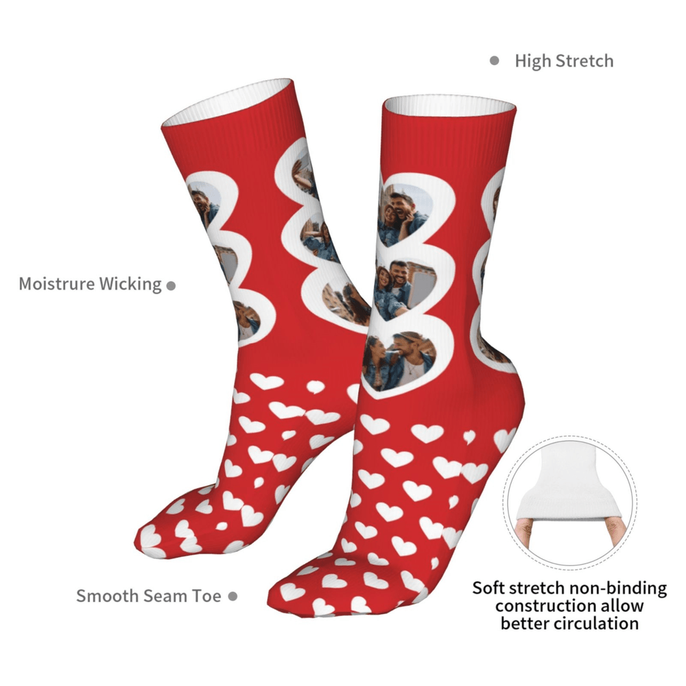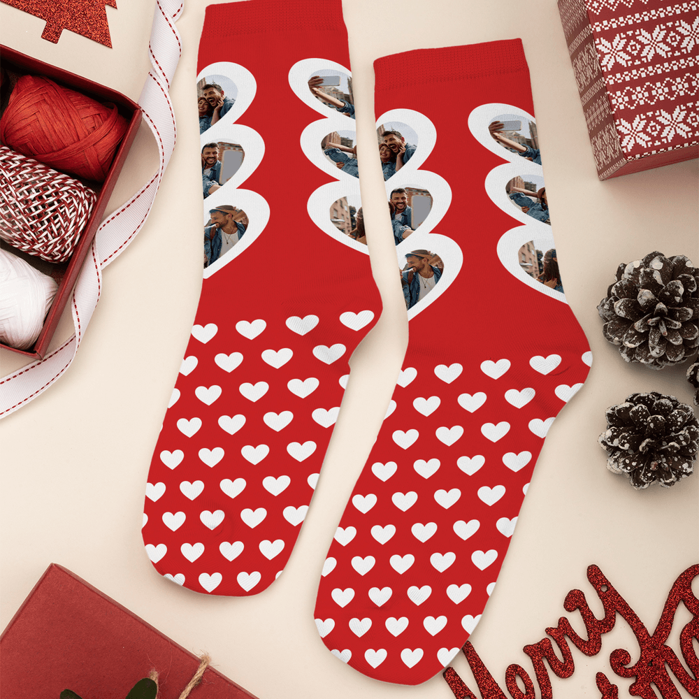 These socks feature red as the primary color, symbolizing passionate love and romance. The bottom of the socks is decorated with neatly arranged white hearts. Up to three couple photos can be added to create a heart-shaped pattern, allowing you to wear your sweetest memories on your feet, silently expressing your love. Whether it's a photo from your first date or a sweet moment from a trip, these socks can be perfectly preserved and transformed into a special "memento of love."
