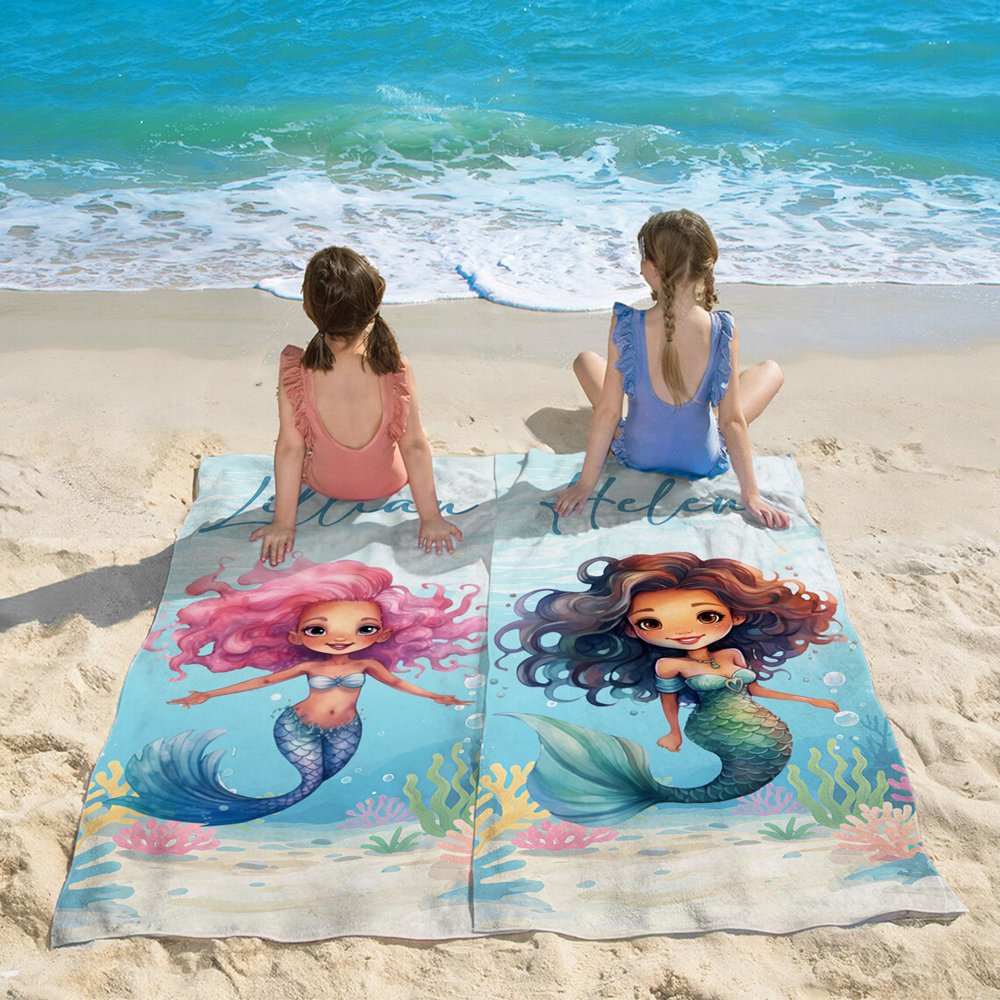 The large size provides ample coverage for kids after water play, keeping them dry and comfortable. The adorable mermaid design and custom name make beach or pool time even more delightful. Whether lounging by the pool, sunbathing, or reading a book, this beach towel is the perfect companion.