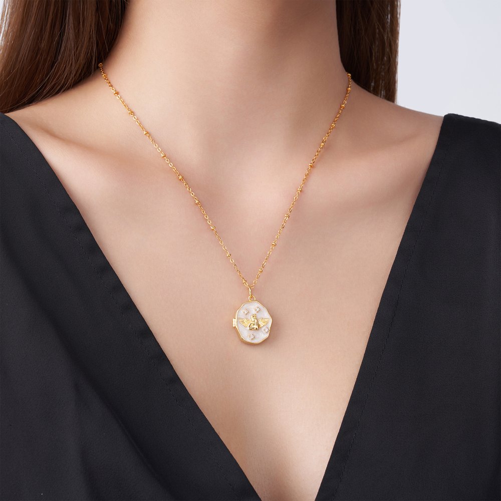 This stunning necklace perfectly blends elegance and sensuality. The pendant features a locket-like design featuring an exquisite angel, symbolizing love and protection. Four sparkling zircons surround the pendant, revealing a personalized photo interior. You can choose to customize one or two precious photos, keeping your memories vivid and intimate.