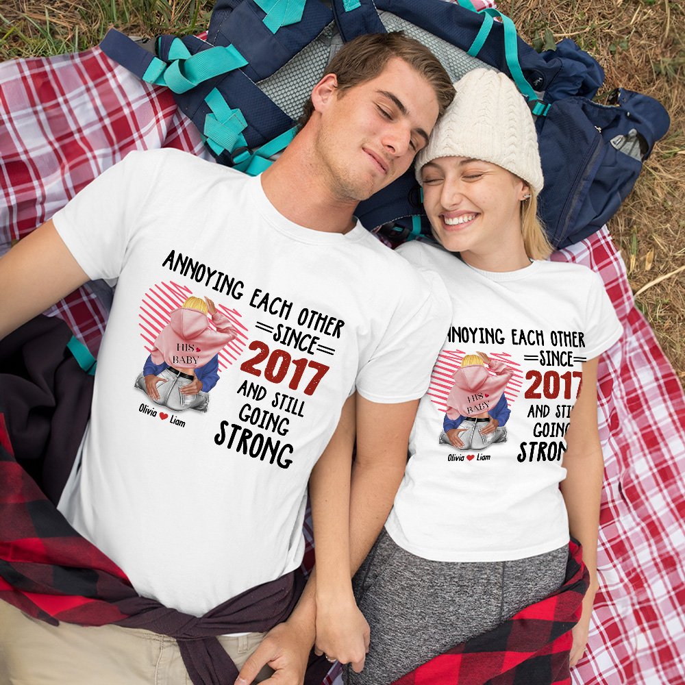 The personalized "Annoying Each Other Since Many Years" t-shirt is the perfect Valentine's Day gift for couples who want to showcase their enduring love and playful bond. The witty and affectionate phrase printed on the shirt reflects the unique dynamics of your relationship, making it a heartfelt and memorable gift choice.