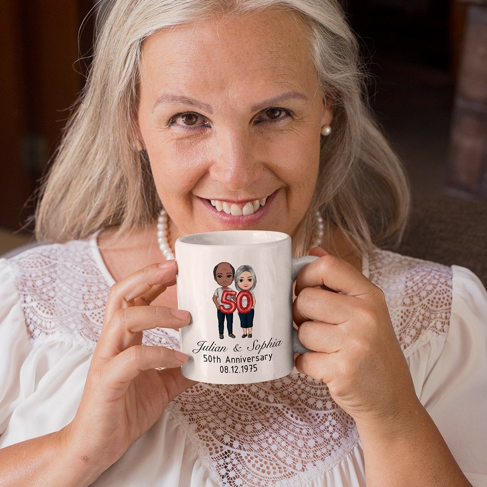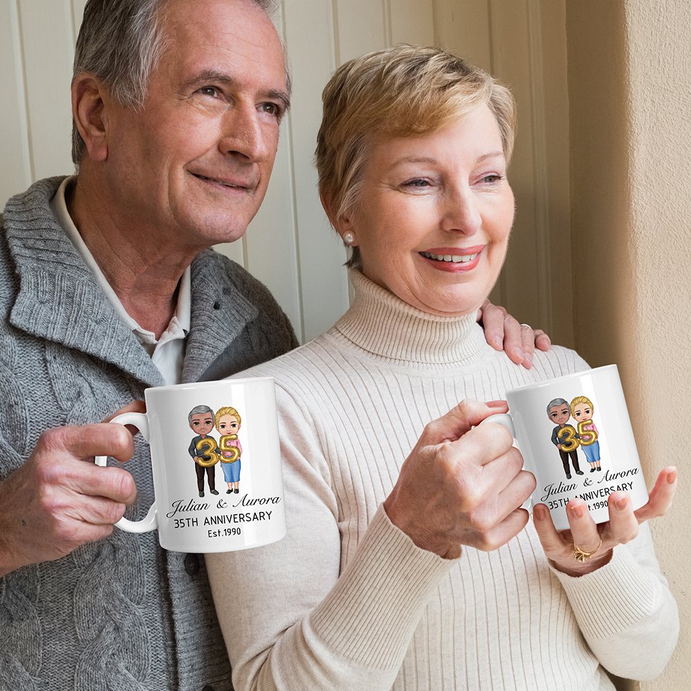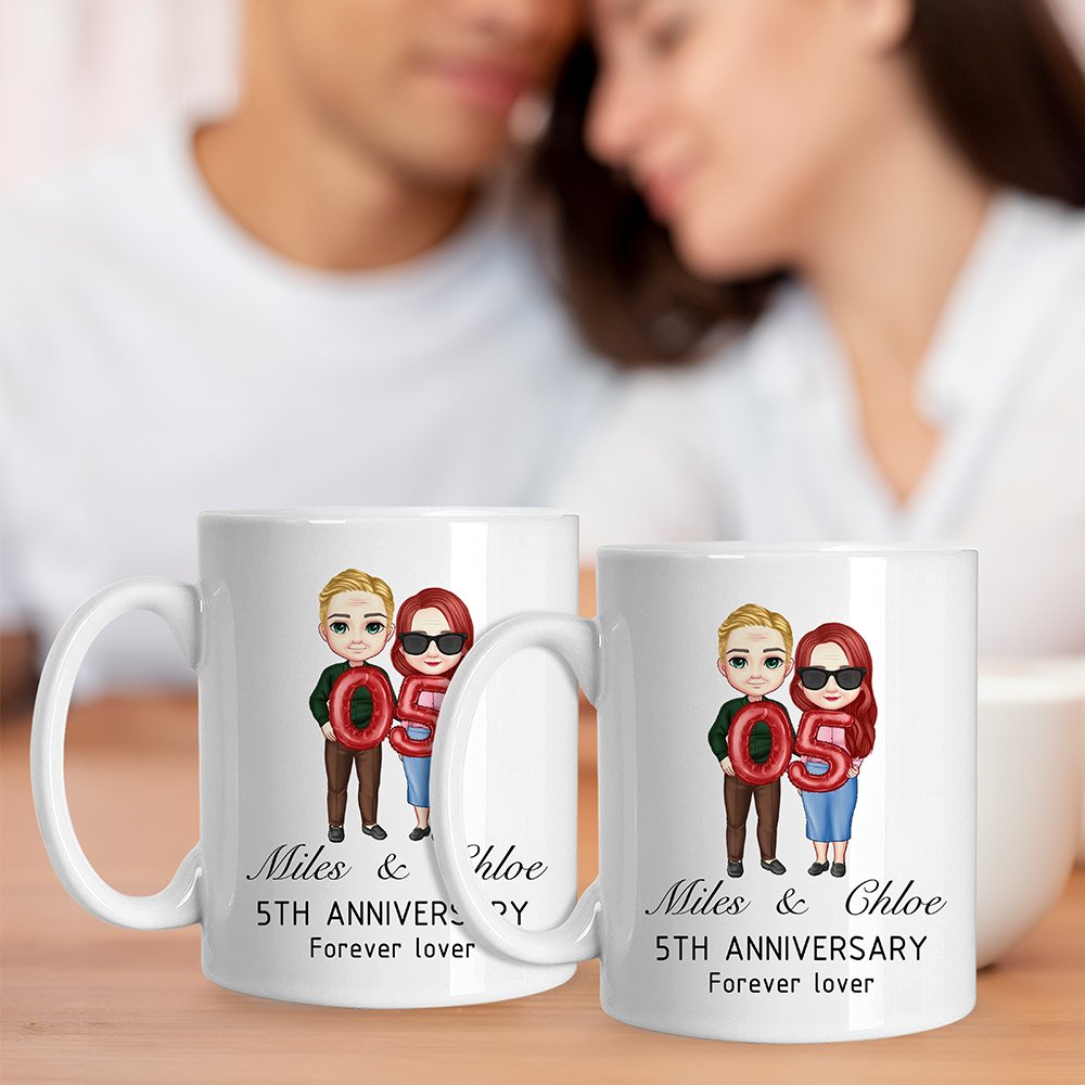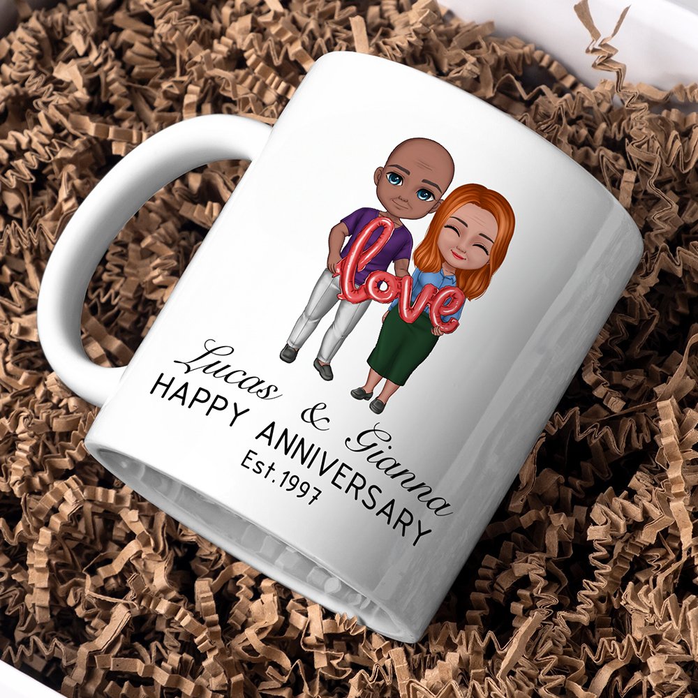 This personalized mug is designed to celebrate your love. Customize the cartoon characters to resemble you and your partner, and add anniversary numbers crafted from whimsical balloons. This combination brings a playful and personal touch that reflects your unique relationship and cherished moments together.