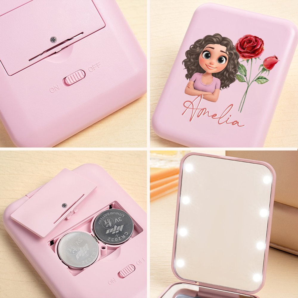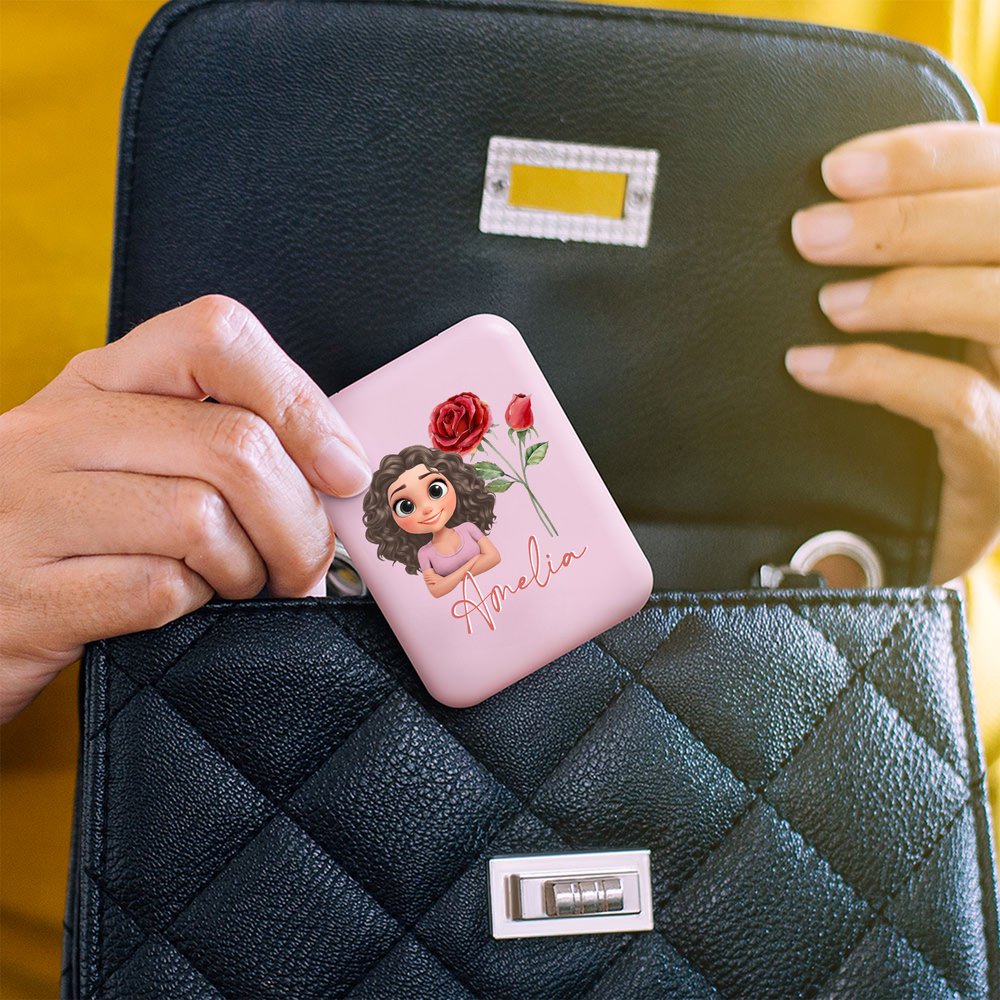 Featuring birthday flower patterns and cartoon characters as core design elements, this design allows for customization with personal names and offers four color options. The overall style seamlessly blends natural elegance with cartoon charm, with the birthday flower symbolizing a unique meaning, while the characters and names highlight a sense of exclusivity. This makeup mirror is not only a beauty tool but also a sophisticated accessory that showcases personal style and taste.