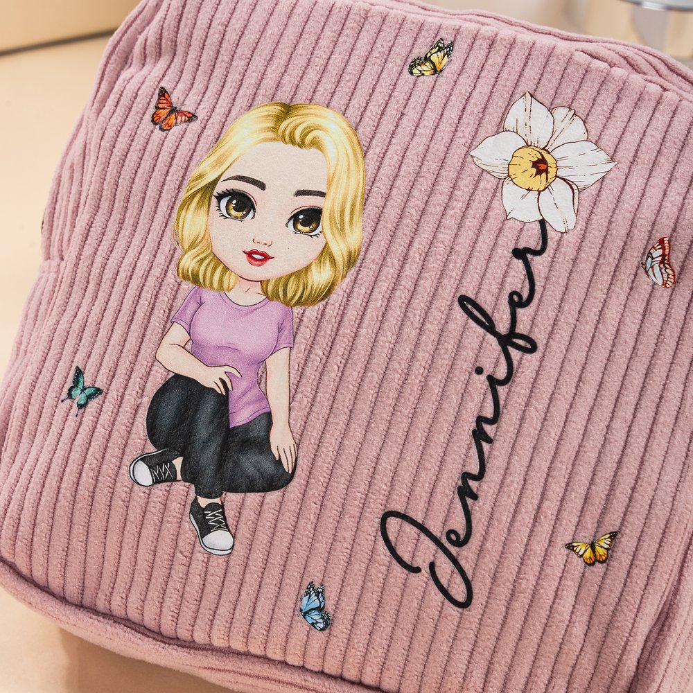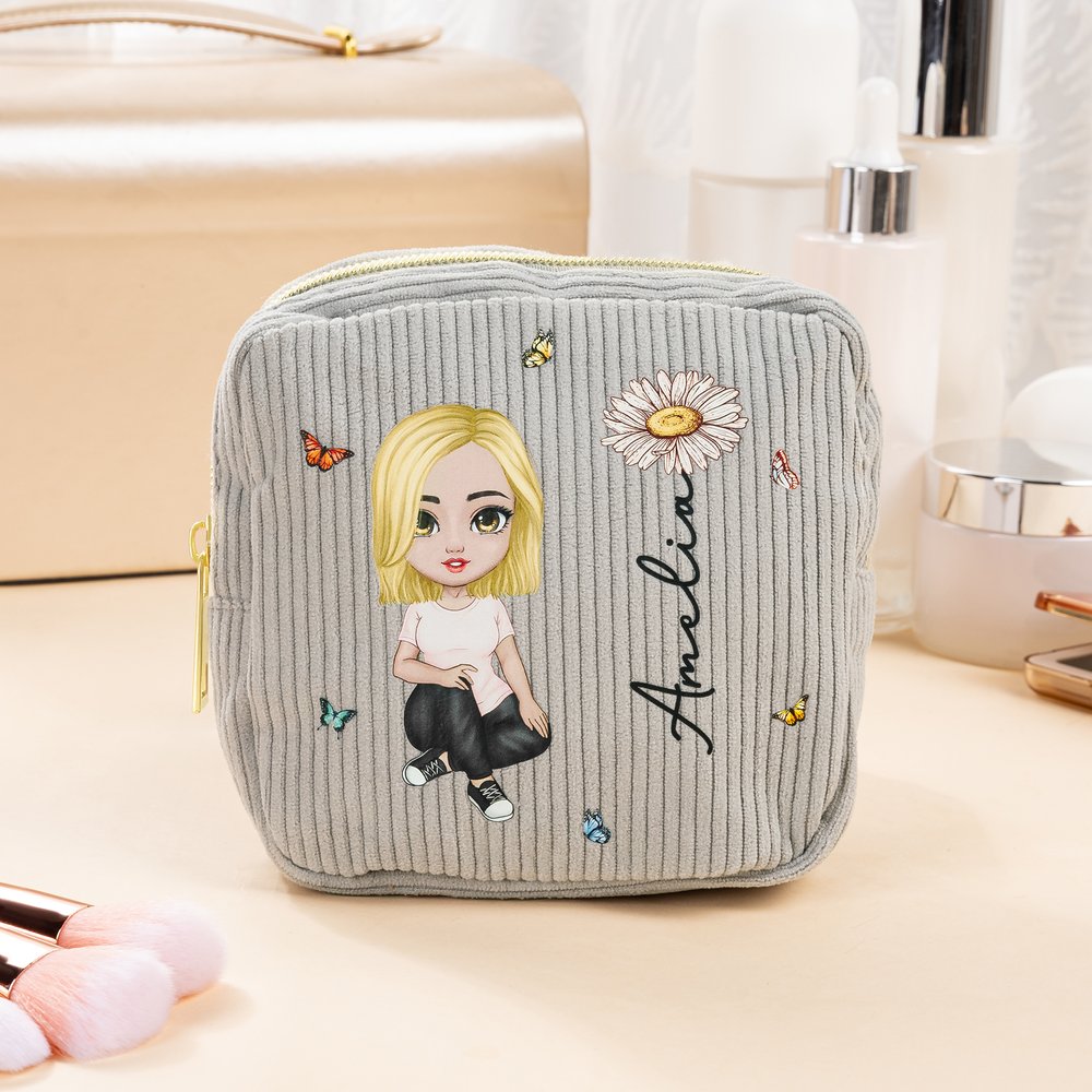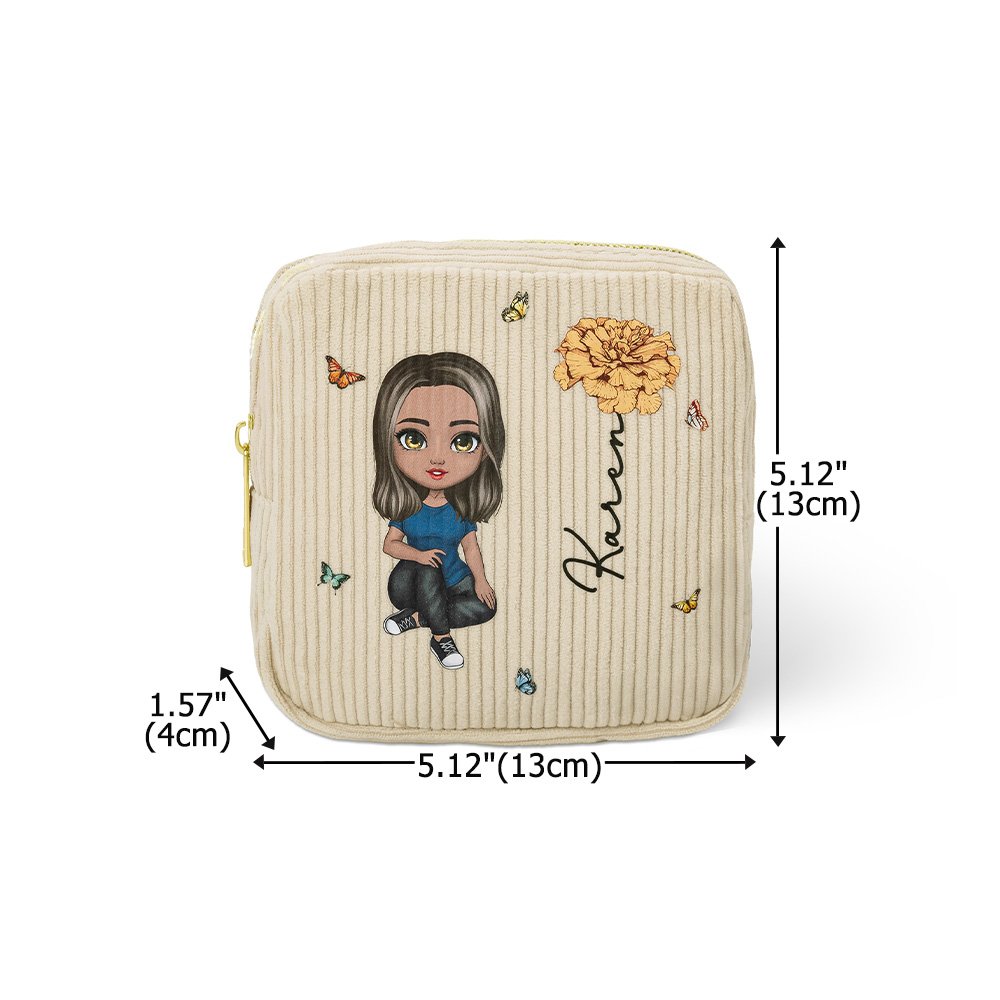 Personalized Birth Flower Cartoon Character Corduroy Sanitary Napkin Storage Bag with Name Portable Travel Essentials Daily Use Gift for Women