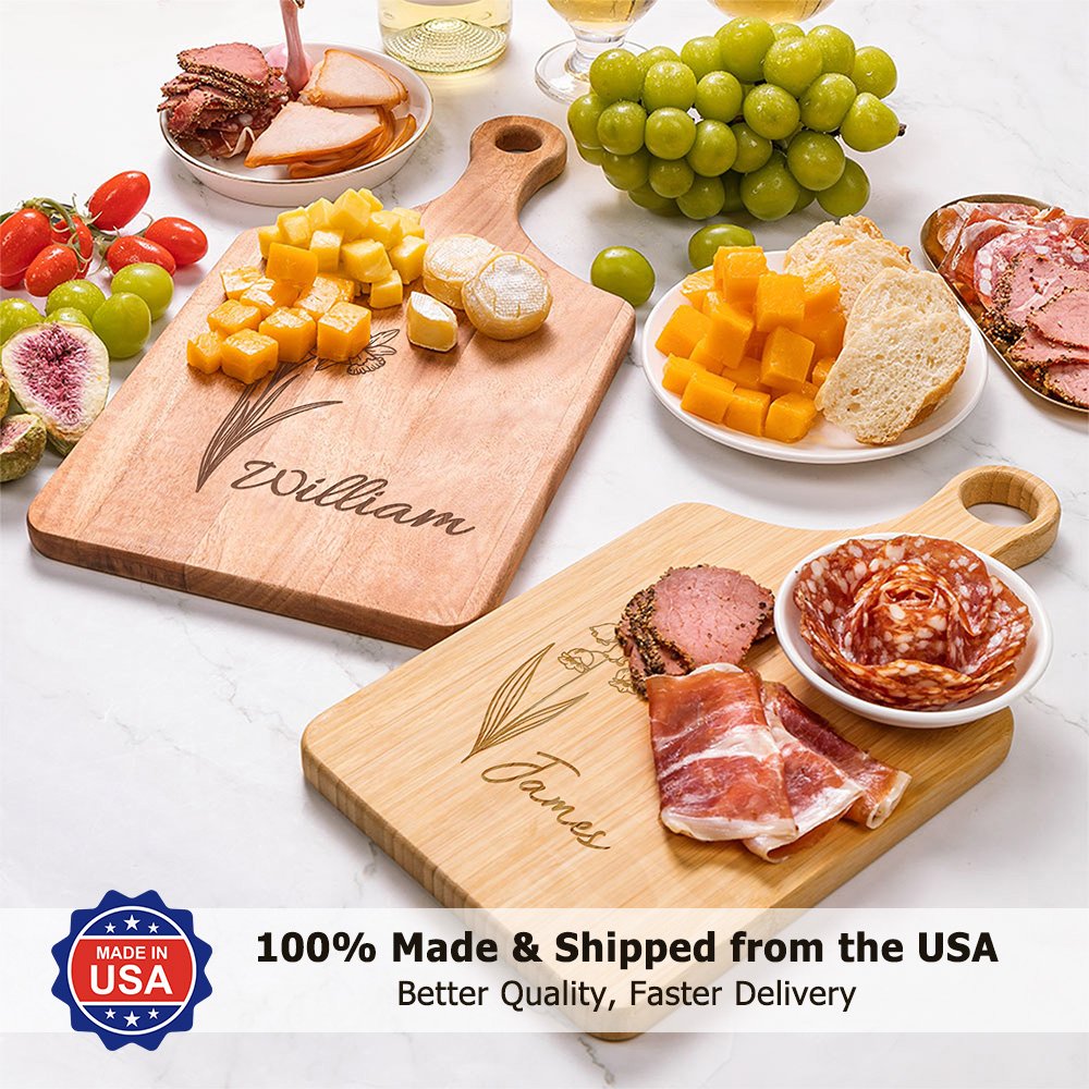 Each cutting board is meticulously carved with a birth flower pattern, each symbolizing a different meaning. You can customize it with your name alongside the flower, making this cutting board a one-of-a-kind piece. Selected woods, including walnut, bamboo, Gabonese mahogany (okoume), and cherry, preserve their natural color and grain, adding a touch of warmth to your kitchen.