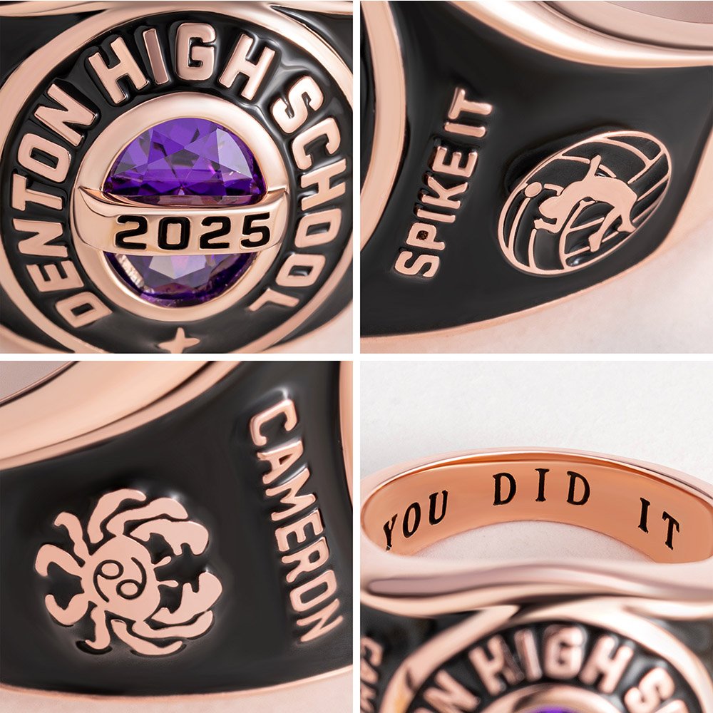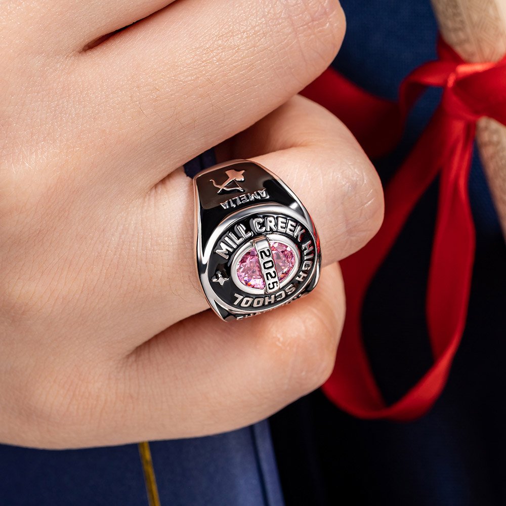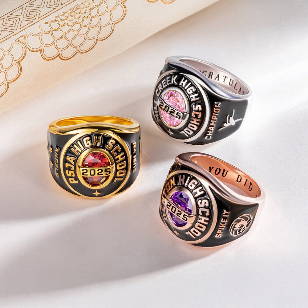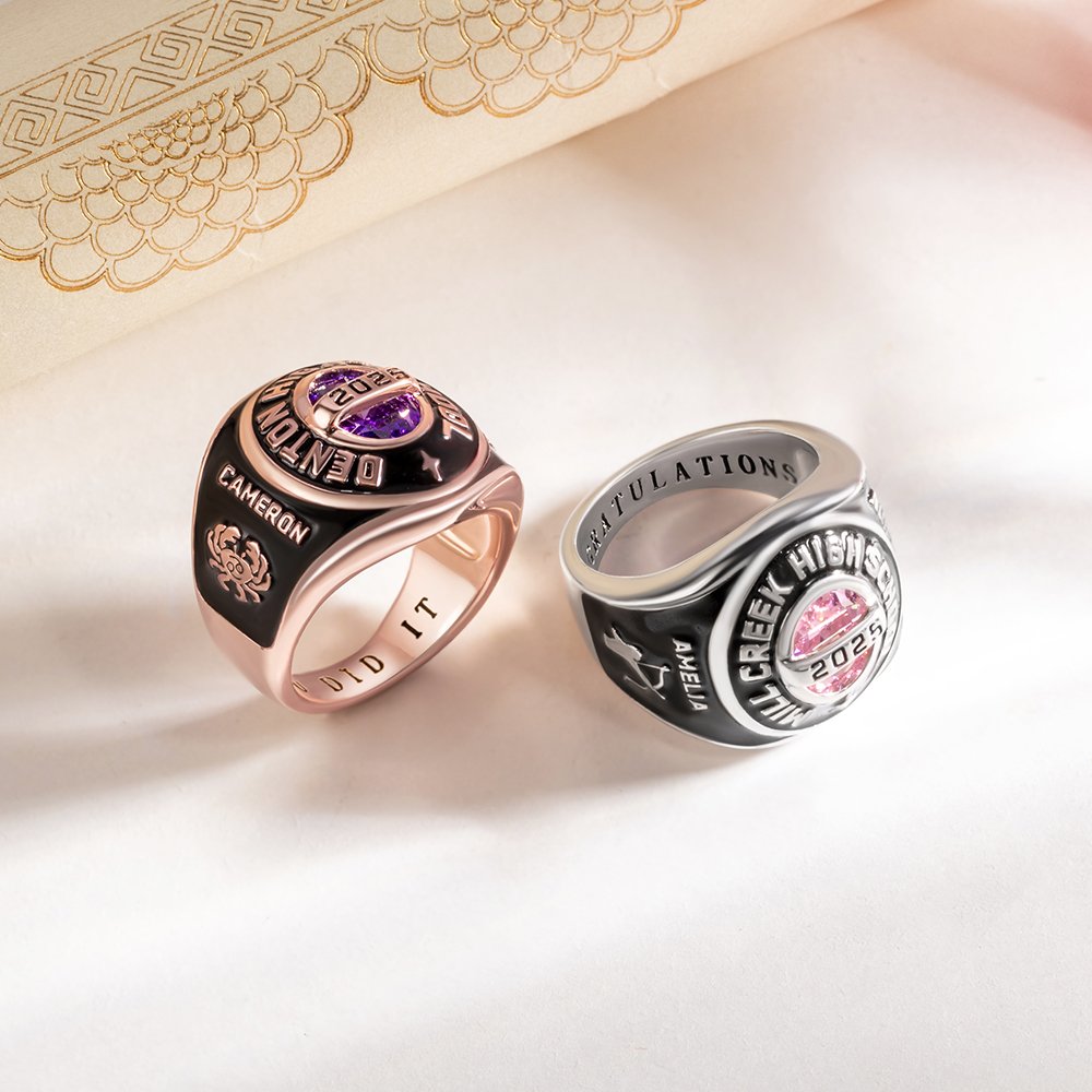 This graduation ring showcases a birthstone at the center, representing your birthday month, surrounded by your school name and graduation year—symbolizing your achievements and pride. The inside can be customized with text for a personal touch. Additionally, the ring offers a variety of themed symbols and logos to choose from, including mascots, sports, zodiac signs, graduation motifs, and clubs, making each piece a treasured keepsake filled with unique memories.