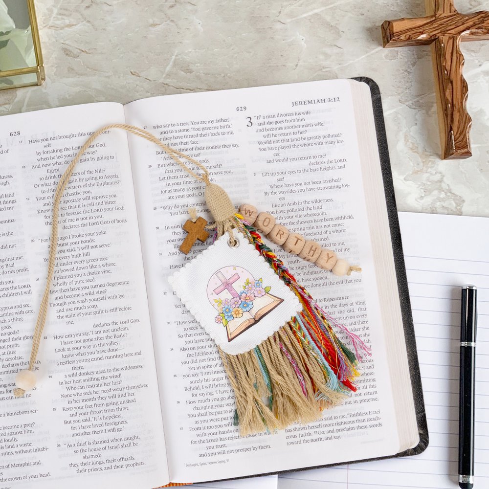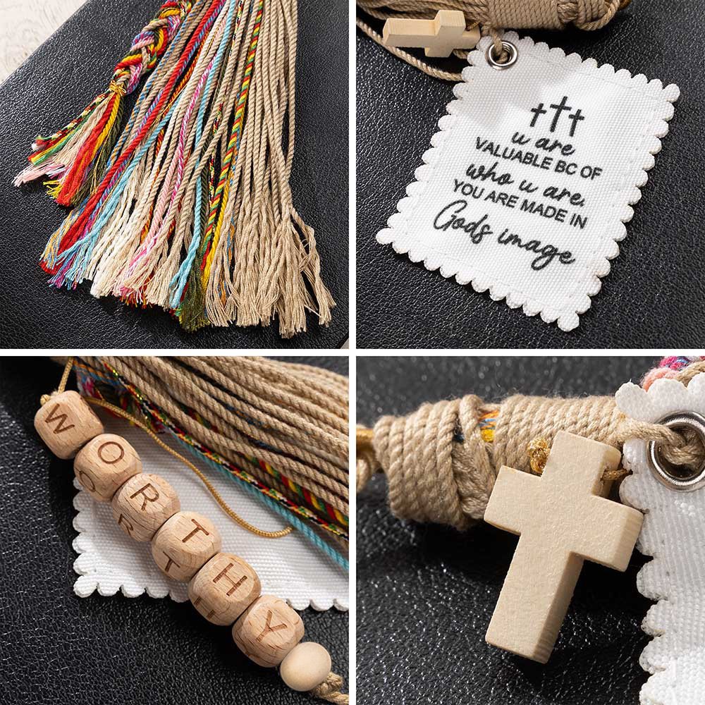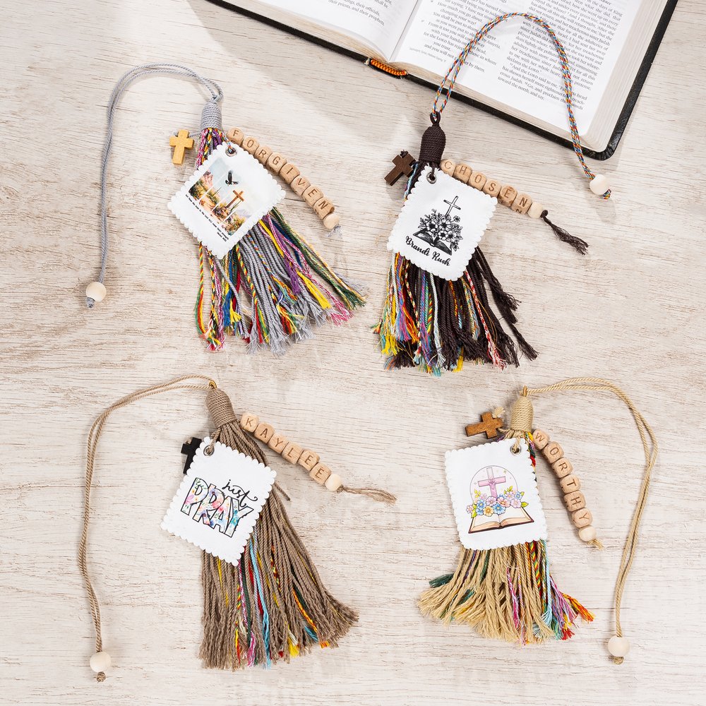 This prayer tassel features an elegant Bohemian design. Each Bible tassel includes multiple tassels, a wooden cross, a fabric strip with customizable scripture content, and a string of wooden beads with customizable content. The elegant design enhances your reading experience and adds a touch of grace to your daily prayers.