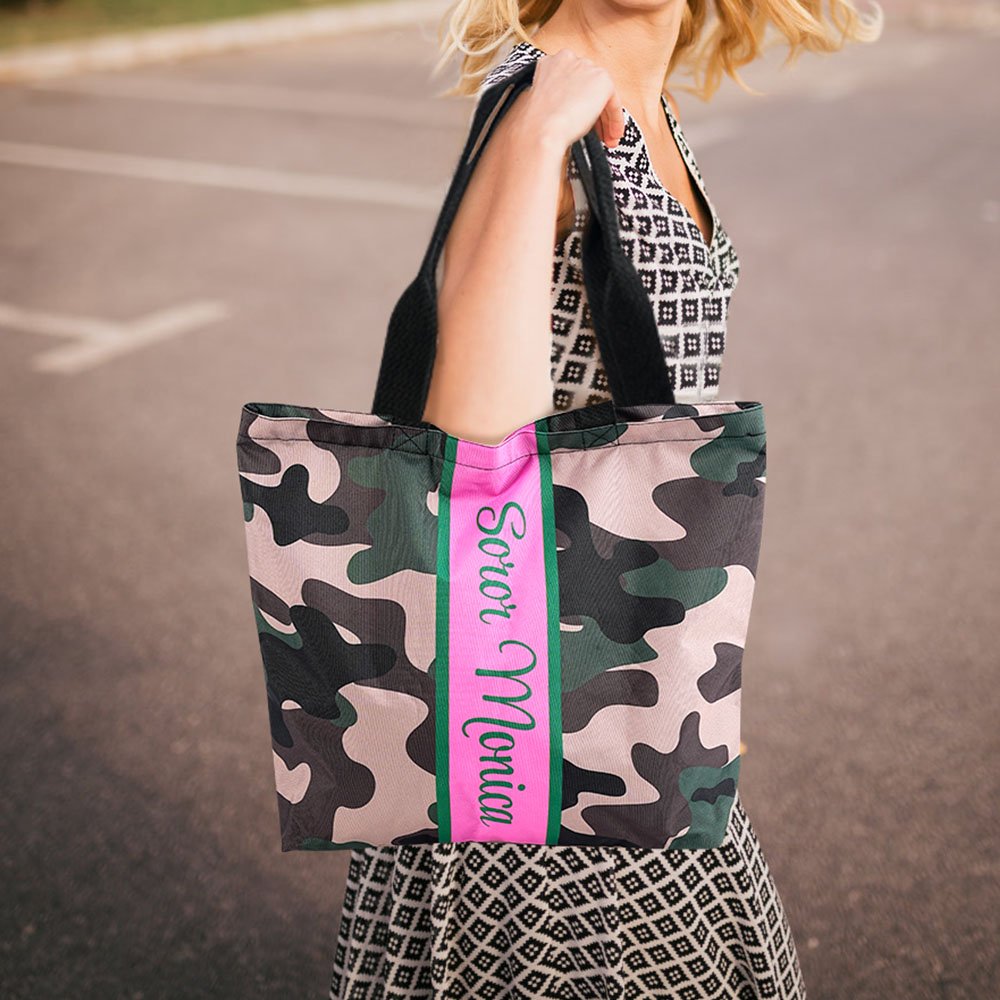 This bag perfectly blends camouflage patterns with a bright pink stripe, showing a tough yet feminine style. The center pink stripe is printed with the word "Sorors" and a customizable name, making each tote unique and perfectly showcasing one's sorority identity and personality.