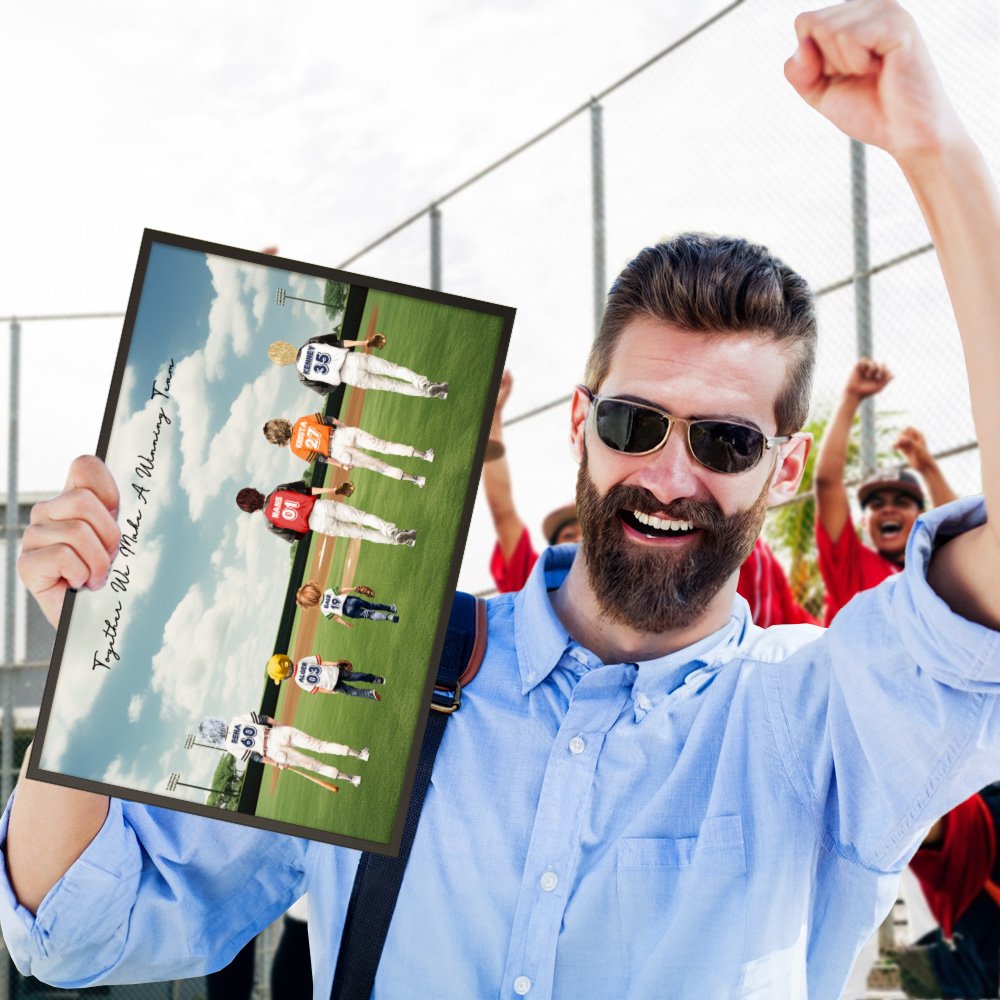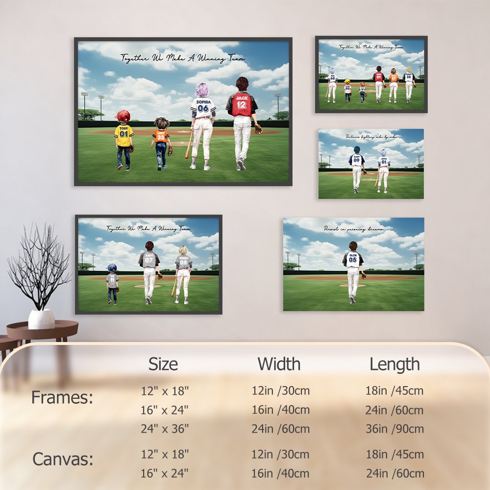 This unique canvas wall art celebrates your baseball family or team with personalized cartoon characters representing 1 to 9 members. Each character can be customized with names, whether boy, girl, woman, or man, turning the artwork into a heartwarming representation of your loved ones or teammates.