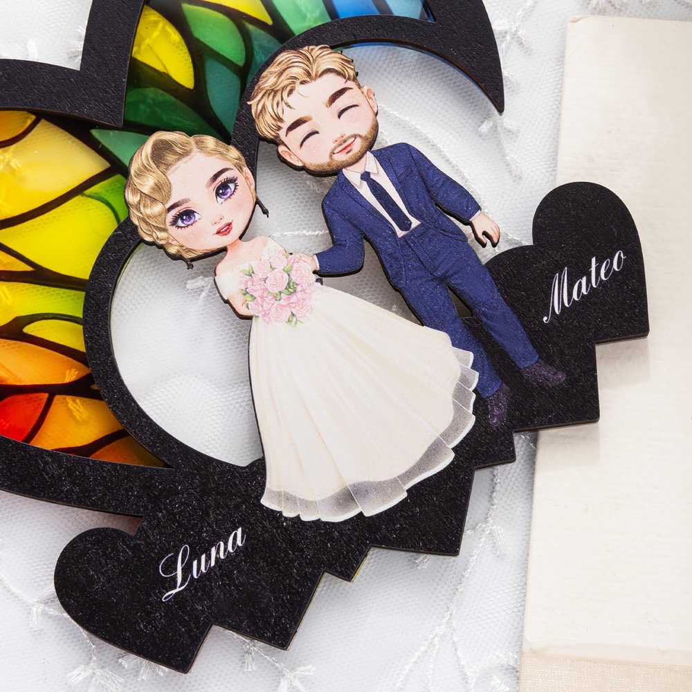 Customized new couple names, the bride and groom's cartoon characters, and the wedding date can be printed on the wood with a delicate and long-lasting effect, making each light catcher a unique love commemoration. The colorful pattern design complements the transparency of the heart-shaped acrylic, making the colors more vivid and faster when exposed to sunlight, as if sealing the happy moments of the newlyweds forever.