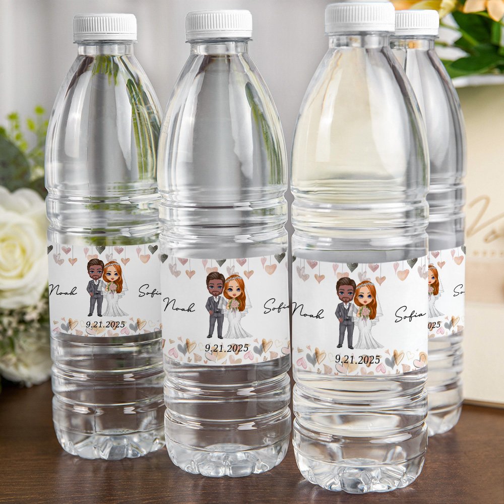 This water bottle sticker is designed with a cartoon bride and groom, and the background incorporates love elements to set up a romantic and sweet wedding scene, full of love, implying the eternity of love and commitment. You can customize the names of the couple and add the date to add an exclusive romance and joy.
