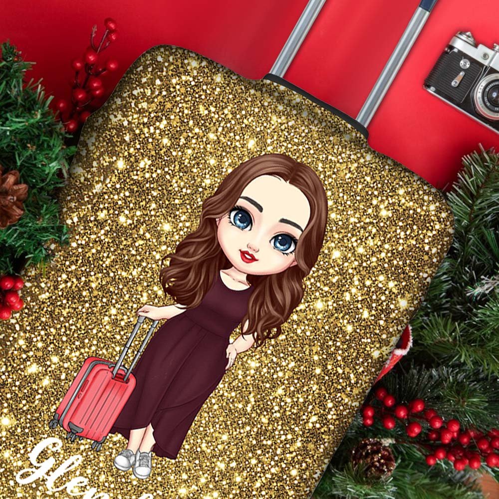 Personalize this luggage cover with a cartoon girl or woman character and a name, adding a fun and unique touch showcasing the traveler's personality.