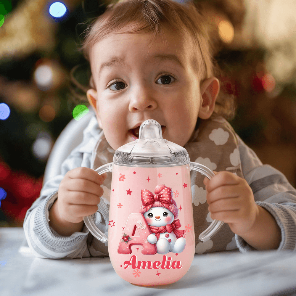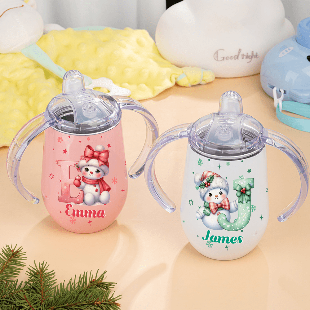 The sippy cup features a playful cartoon snowman and alphabet pattern, brimming with childlike innocence and vitality, perfectly matching any child's aesthetic preferences. Customizable with your own name and a choice of eight rich colors, it caters to every child's individual needs while making each sippy cup unique.