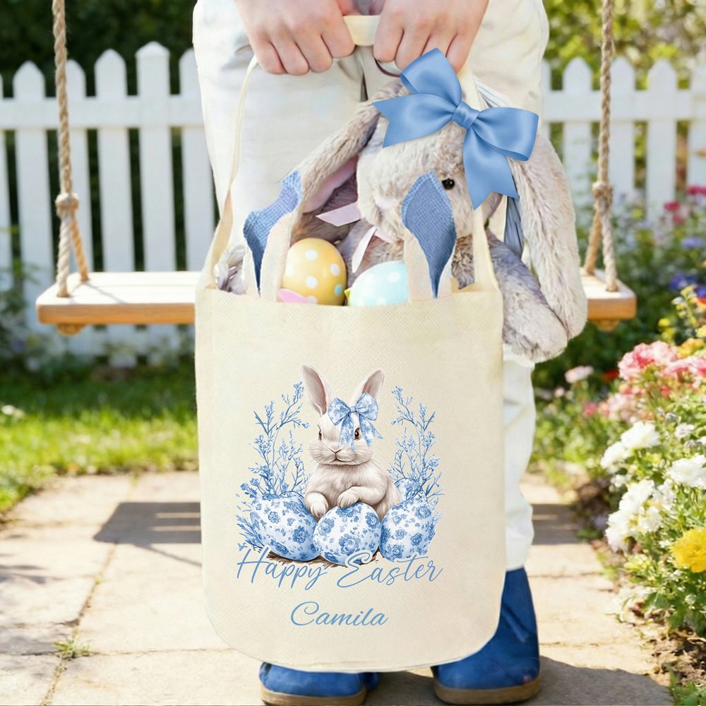 The design inspiration for this Easter storage basket comes from the pure joy and lively innocence in children's eyes during the festival. It features soft, three-dimensional fabric rabbit ears as the core highlight. The front of the basket displays a Bunny image with an exquisite bow tie. Surrounding its feet are Easter eggs of the same color, complemented by a variety of spring-inspired colors. "Happy Easter" and a custom name are printed below, integrating the colorful elements of Easter with a personal touch. Every detail anticipates the festive ritual, forging personalized customization into a bond that connects love and joy.