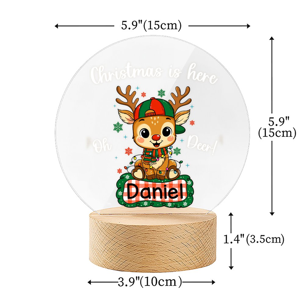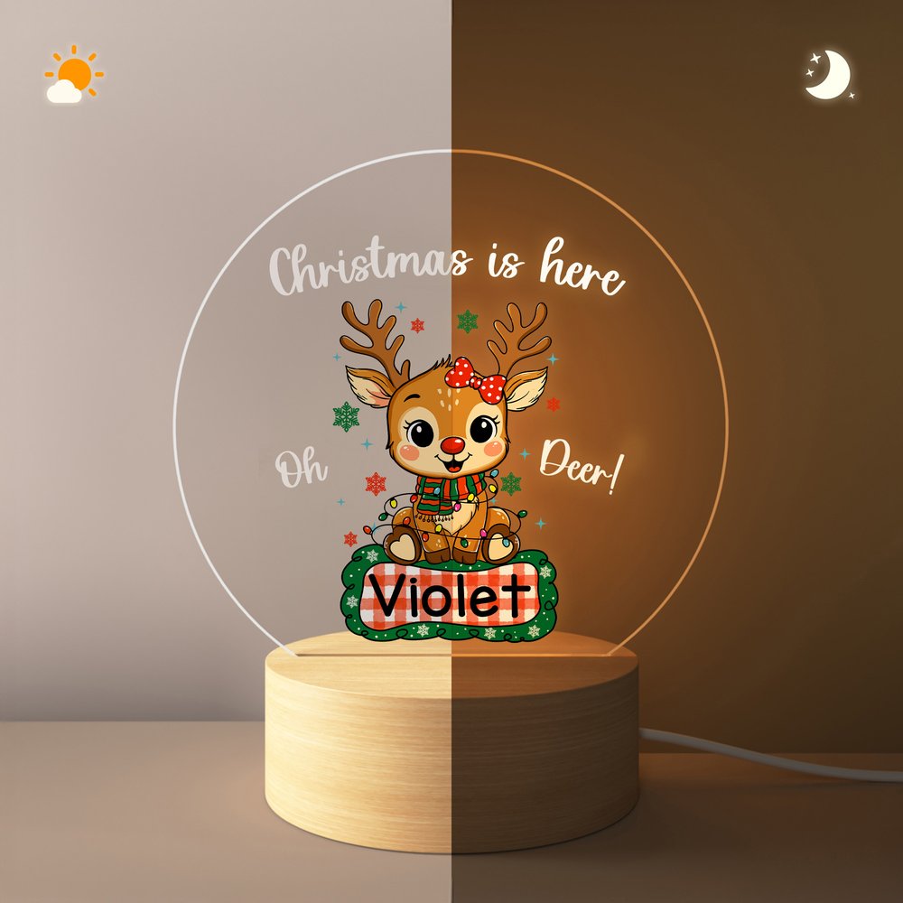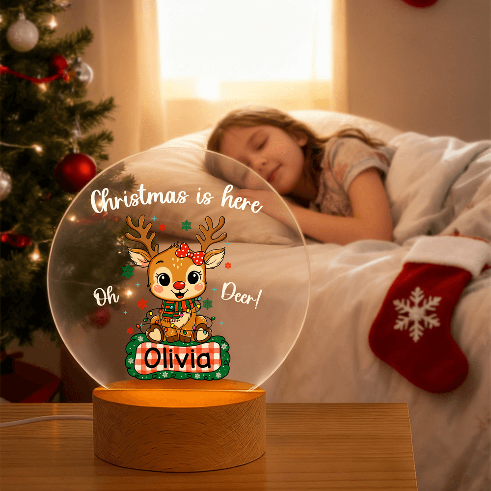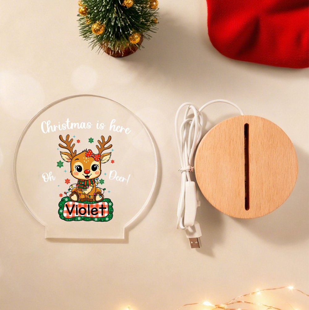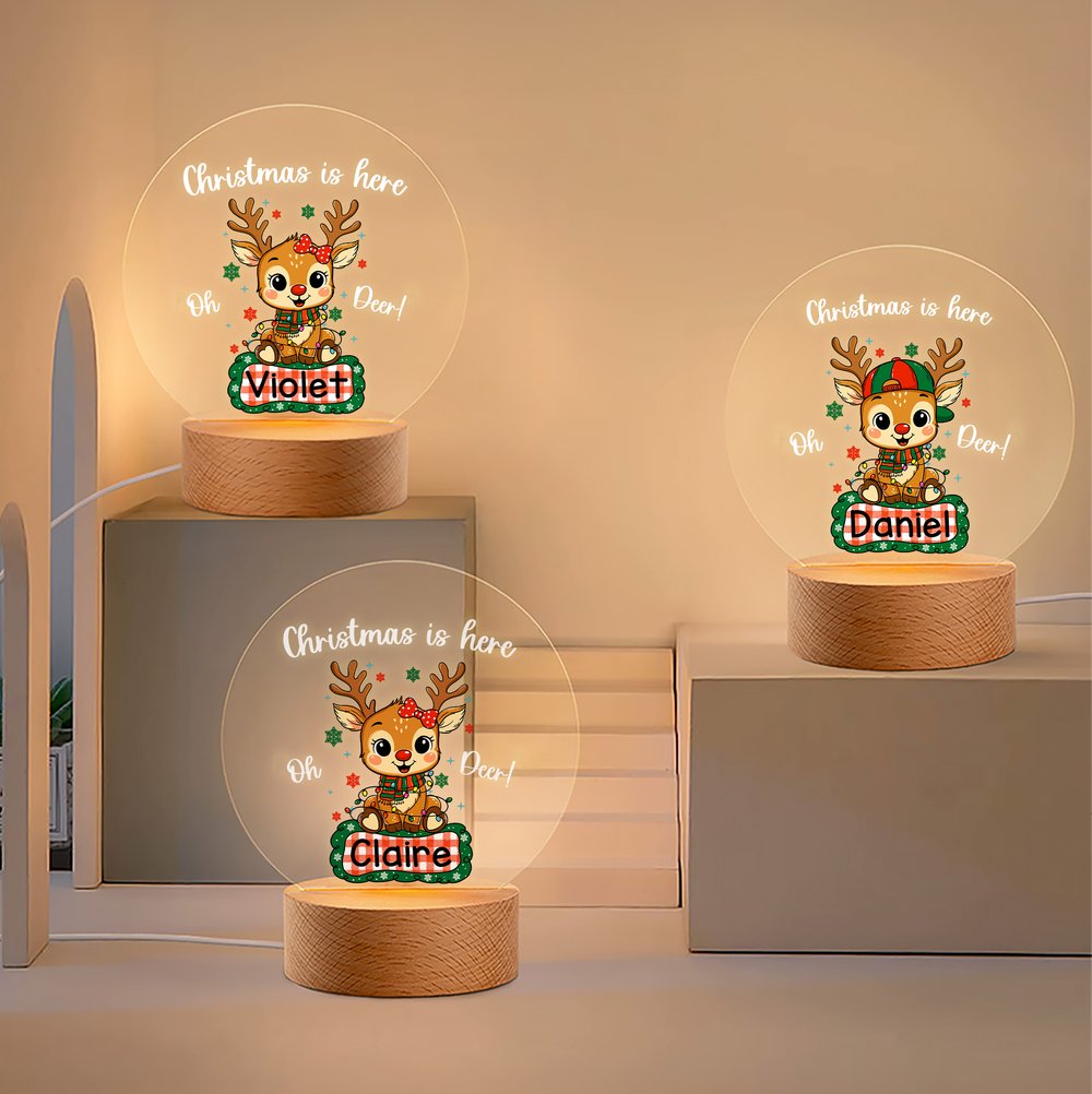 Featuring an adorable Christmas deer surrounded by festive elements like snowflakes and soft, glowing lights, this night lamp brings warm holiday cheer into any child’s room. The playful woodland style adds both cuteness and seasonal charm, making it a delightful addition to a nursery or Christmas home décor. To make this gift unique, each acrylic night light can be customized with your child's name.