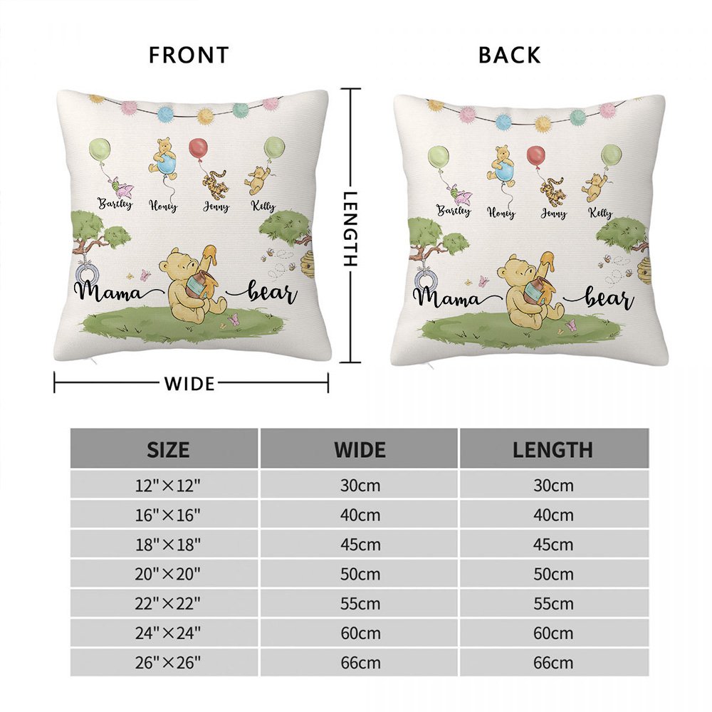 This pillow's design features the classic Winnie the Pooh created by the famous writer A.A. Milne. It is paired with cuddly baby animals surrounded by green grasses, trees, and butterflies, creating a playful and warm atmosphere. The pillow can also be customized with 1-5 animals and the corresponding names of each family member to reflect your unique personality.