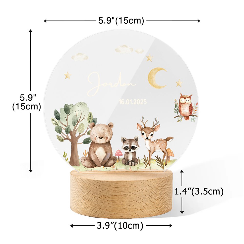This night light features adorable animal prints, including a bear, deer, raccoon, and owl. Surrounded by trees, clouds, and a moon, it creates a forest-like atmosphere. Customizable names and text can be added to create a one-of-a-kind ornament.