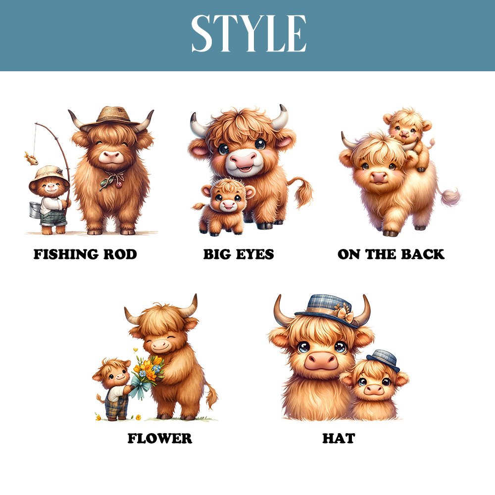 The front of the clothing is adorned with a delightful illustration of various styles of Highland cows, with their signature shaggy fur and gentle expression. This playful and whimsical design will capture the hearts of both parents and little ones, adding a touch of warmth and personality to this already exceptional garment.