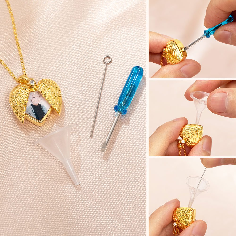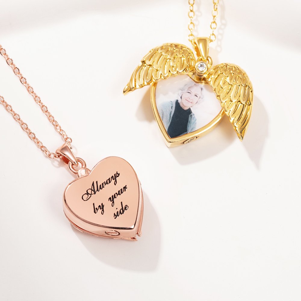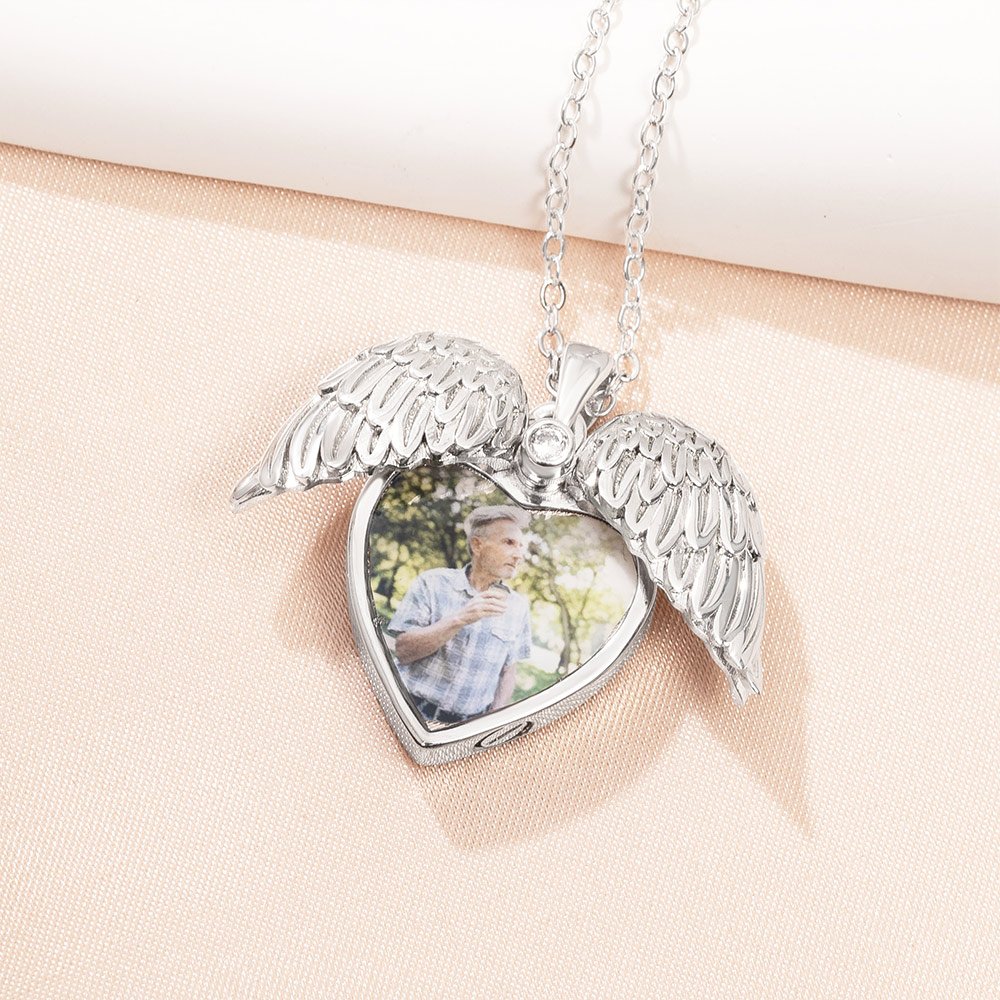 Personalized Dainty Angel Wing Heart Photo Urn Necklace for Ashes with Engraved Text Cremation Jewelry Memorial Gift for Women