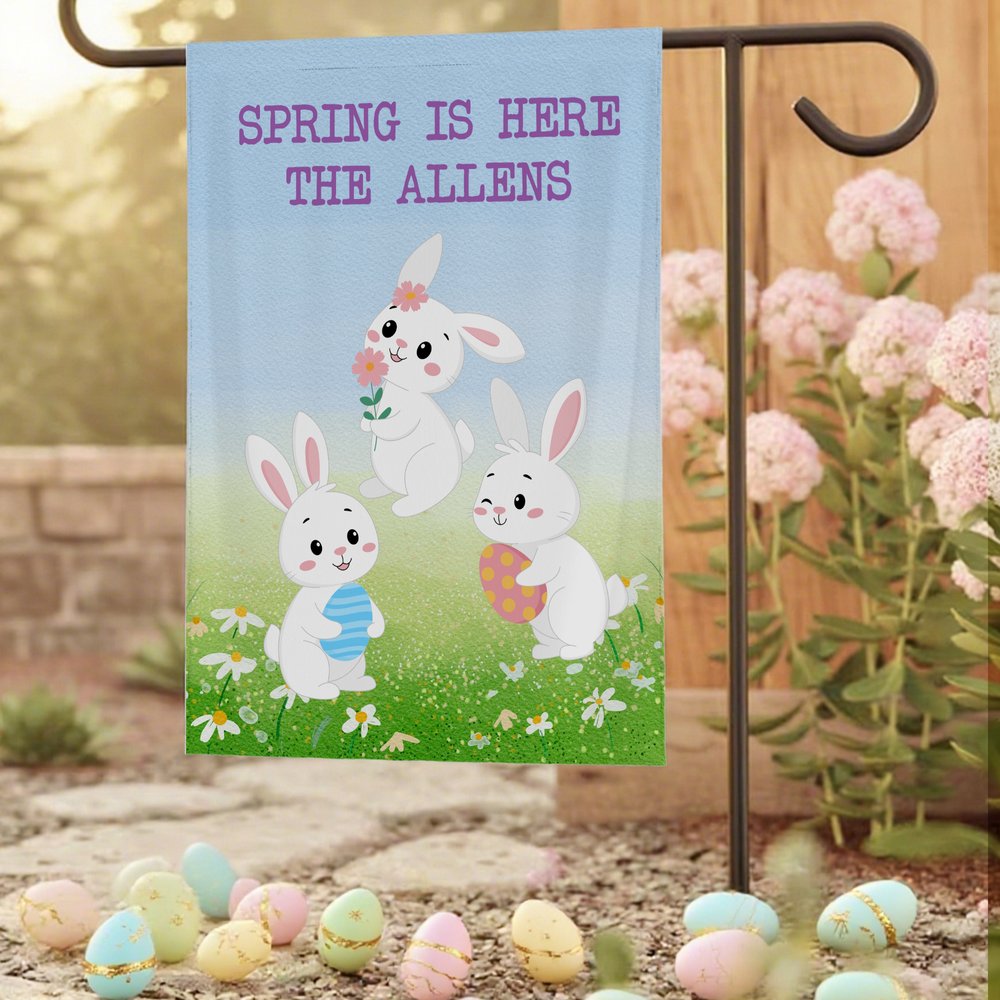 Three lively white rabbits form the centerpiece of this vibrant spring garden scene. A daisy-dotted meadow teems with life beneath a fading blue-green sky. One bunny sniffs the flowers, while two others clutch Easter eggs, each a playful gesture. Customizable with text and two sizes, this banner effortlessly infuses your garden with a unique, festive, and warm atmosphere.