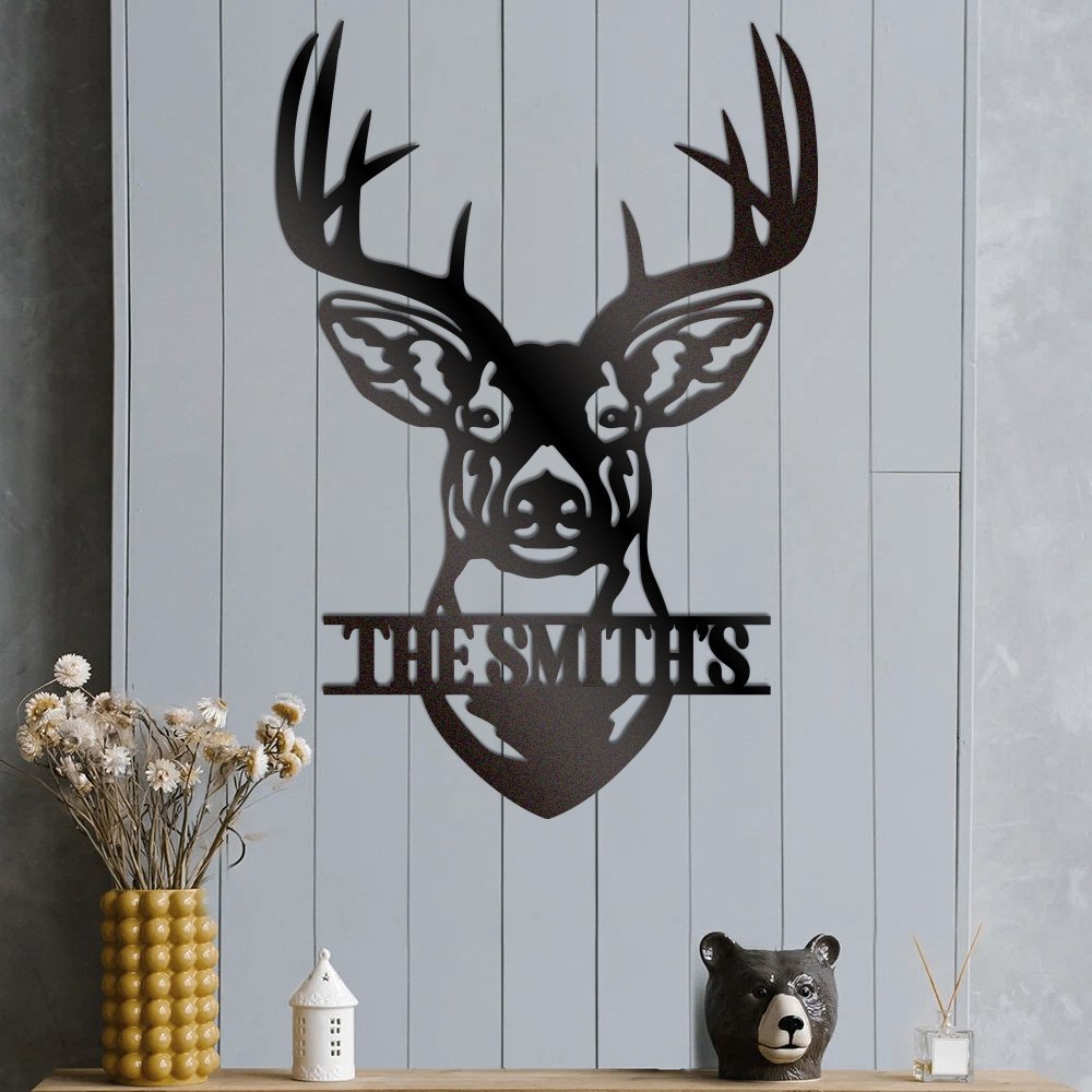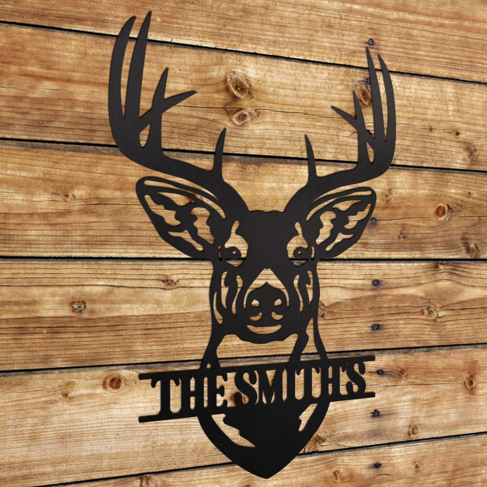 The metal sign features a striking deer head design with intricately detailed antlers, creating a bold and eye-catching focal point for any room. The personalized touch of adding a name to the sign makes it truly unique and special for the recipient Whether you want to display your family name, a special word, or a meaningful date, the customization adds a personal touch. The name is expertly cut into the metal, adding an extra layer of detail to the design.