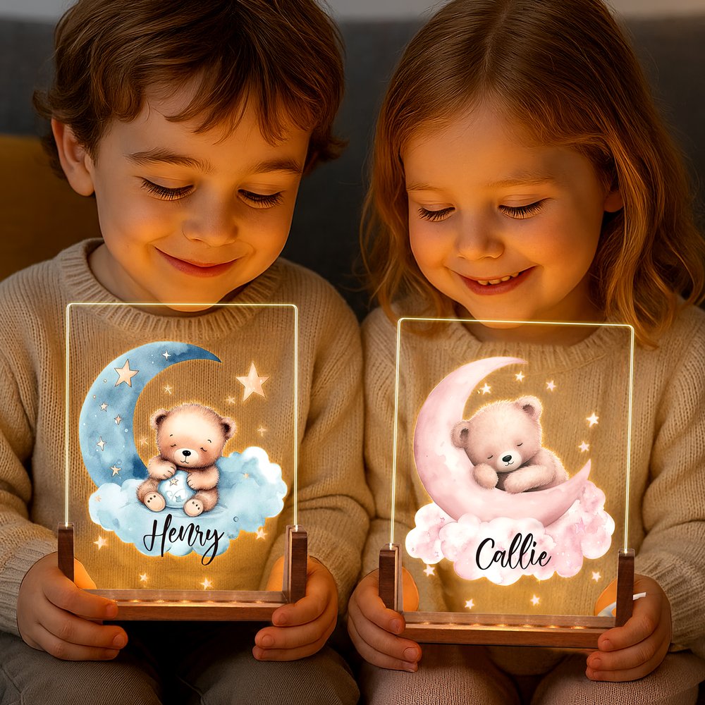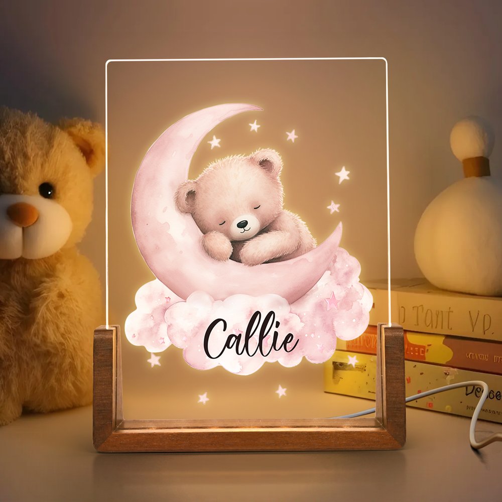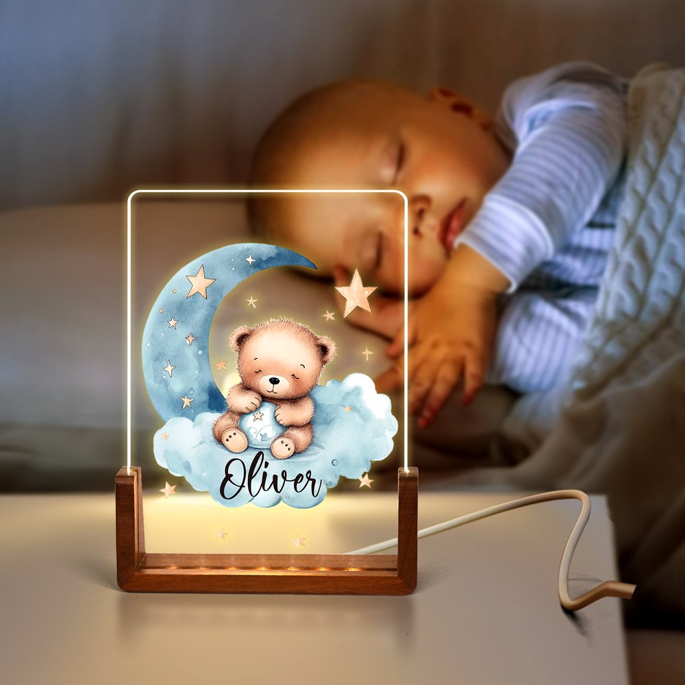 This customizable acrylic night light features a cute teddy bear in pink or blue sitting on a dreamy cloud with shining stars. You can personalize it with your child's name on the cloud, making it a unique gift.