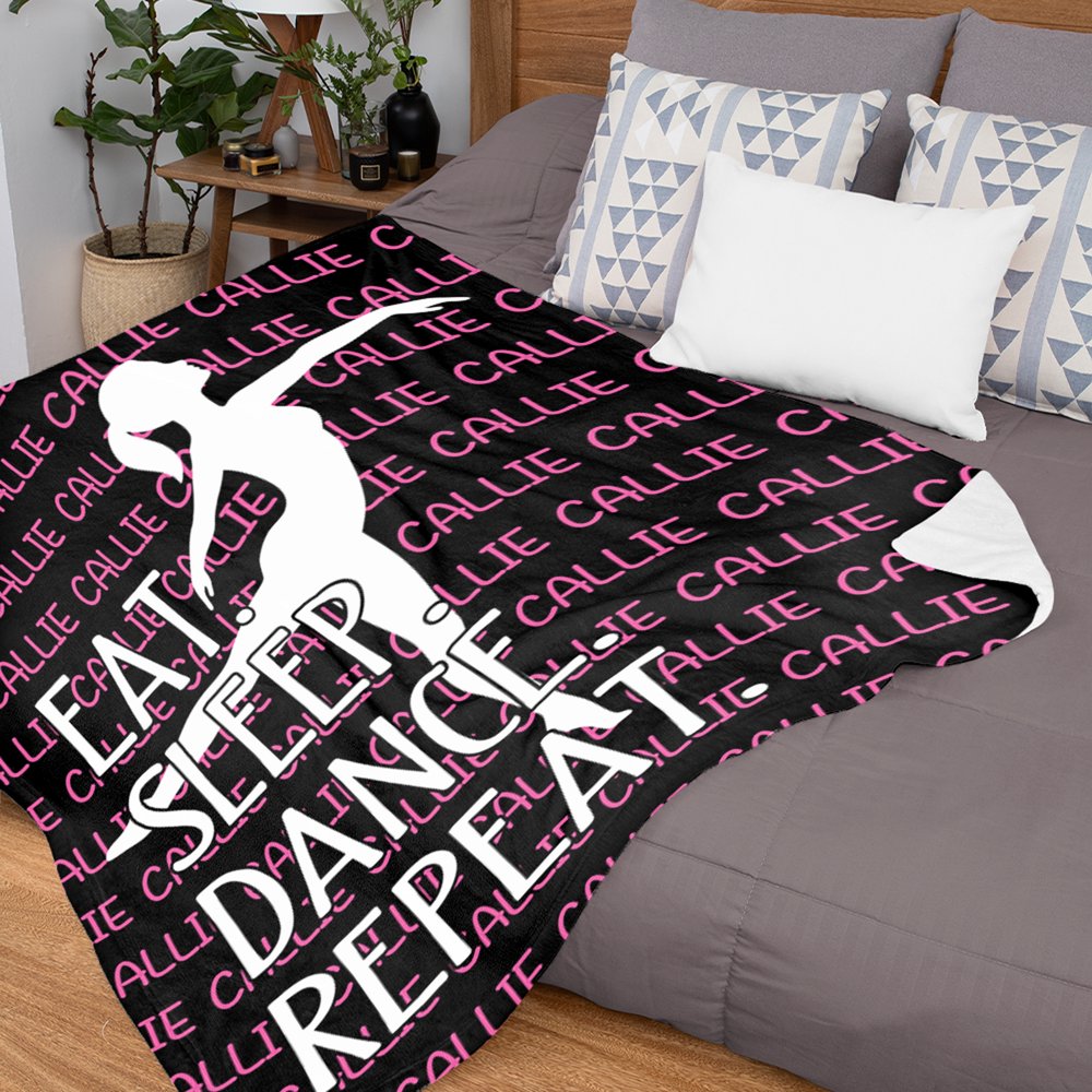 The vibrant silhouette of a dancing woman stands as the core visual element, capturing her graceful movements with fluid elegance. The dense pink typography of the name, intricately printed on the blanket, artfully merges personal commemoration with aesthetic beauty, reflecting a profound passion for dance.