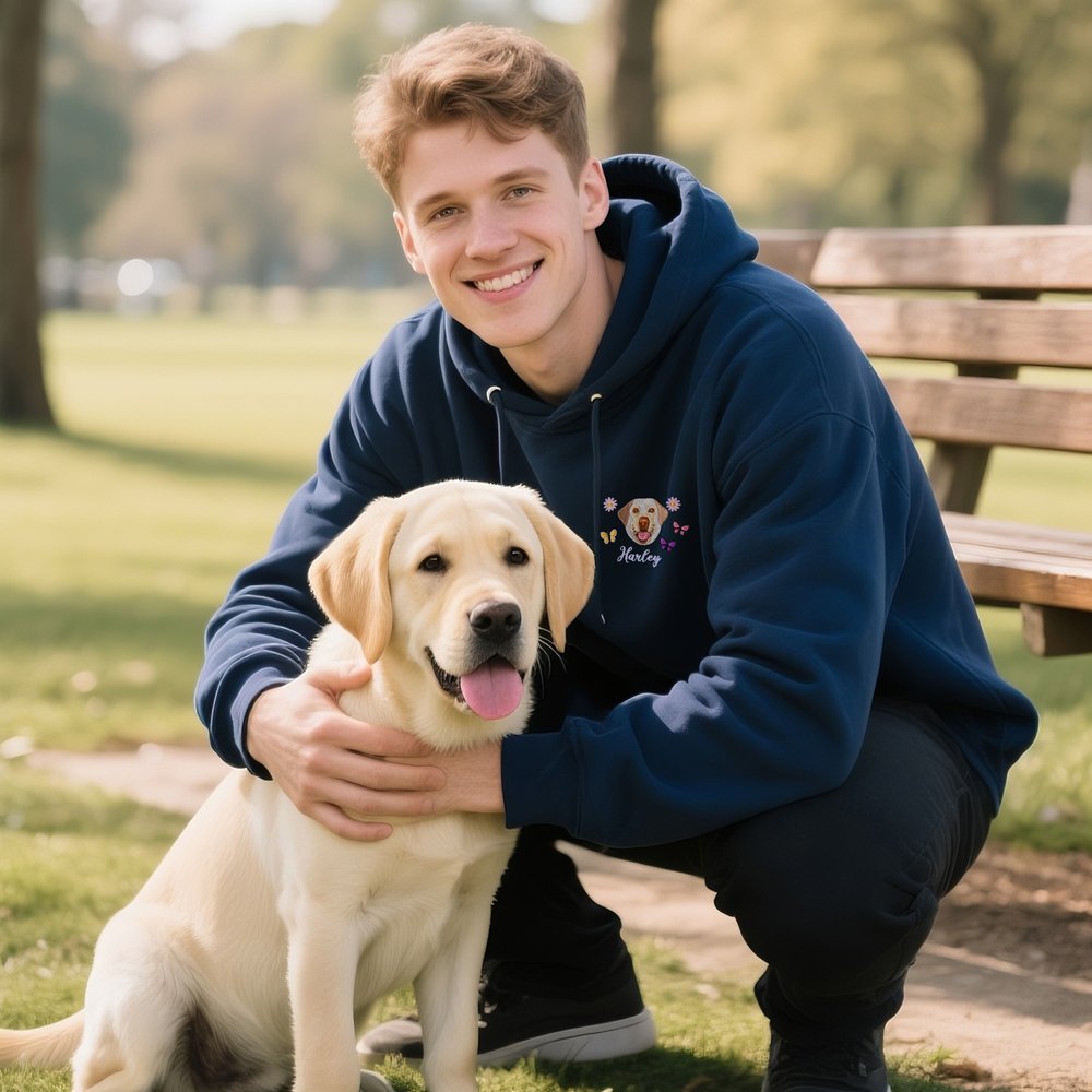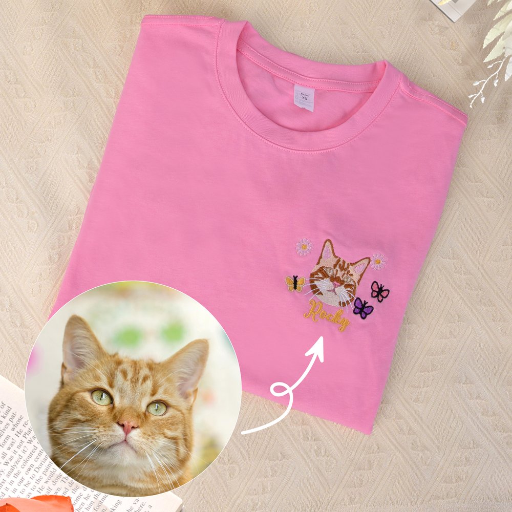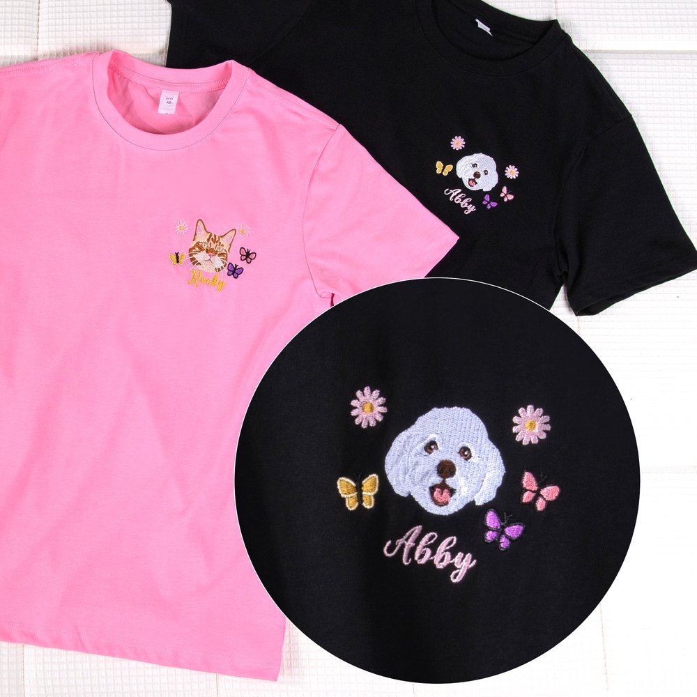 This garment features a distinctive embroidery technique that seamlessly incorporates your uploaded pet's photo and name into the fabric. The playful flowers and butterflies surrounding the design add vitality and charm. Every stitch captures the texture of your pet's fur and their unique expressions, conveying the deep bond you share. It’s not just clothing; it’s a heartfelt expression of your relationship with your pet.
