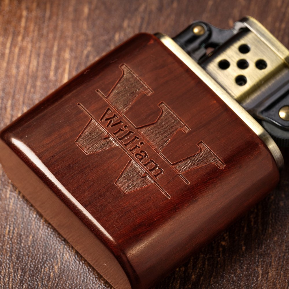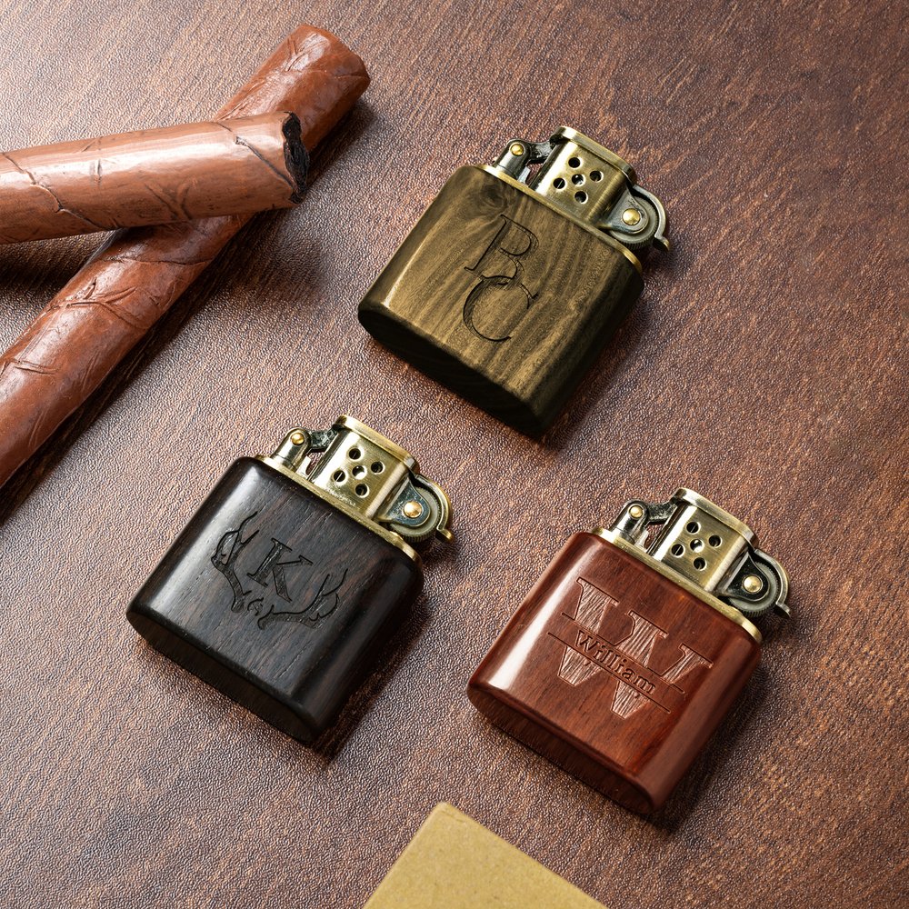This lighter showcases distinctive wood grain patterns that exude vintage sophistication and natural elegance. Choose from 12 unique designs, each customized with finely engraved initials or names, transforming it into a personalized statement piece that radiates timeless charm.