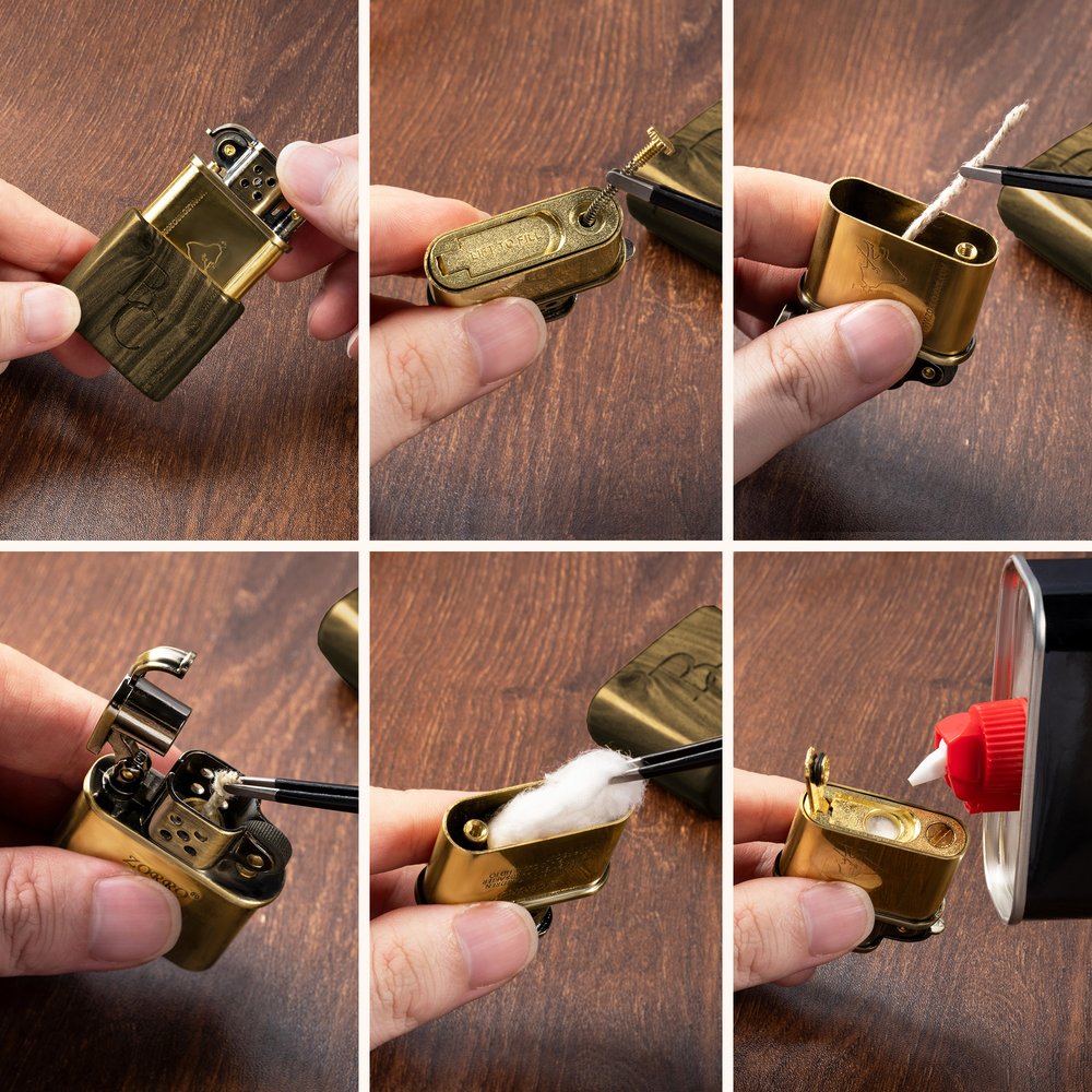 Hold the lighter case between your thumb and index finger (at the windguard) and pull the insert straight upward vertically. Lift the "Lift to Fill" cap at the base of the insert. Align the spout of the kerosene bottle with the cotton and slowly but steadily fill until the cotton is 2/3 to 3/4 saturated (it should feel moist but with no visible drips or pooling). After refueling, let the lighter rest for 2-5 minutes before use.
