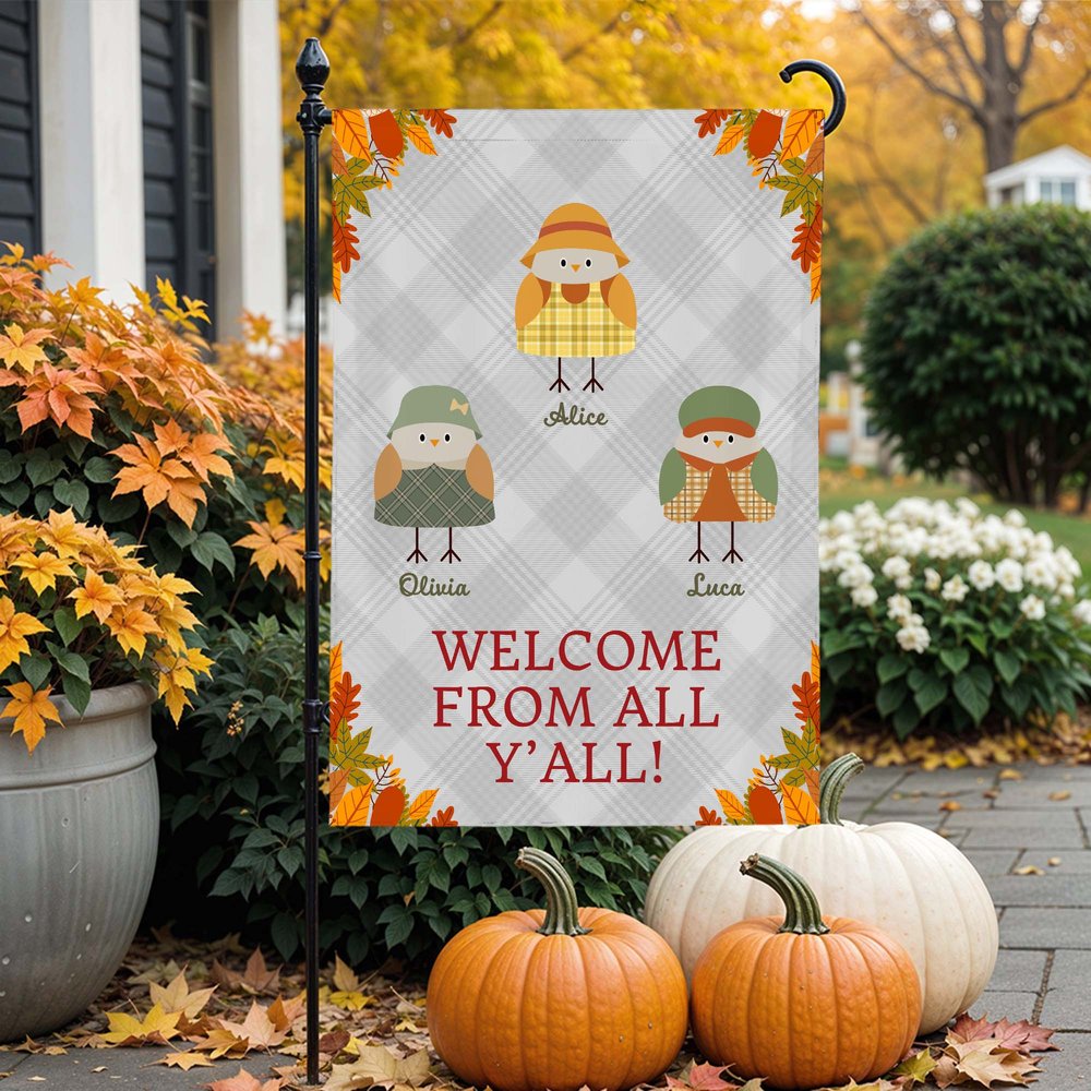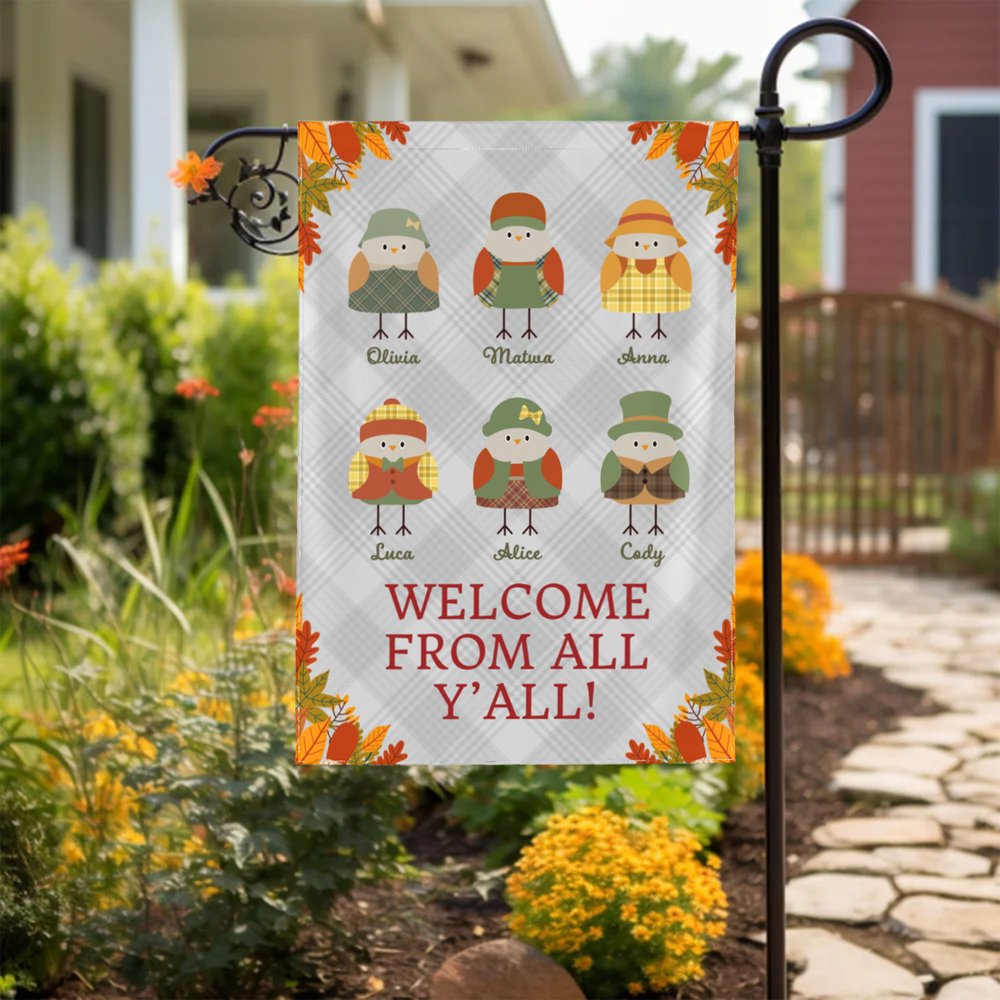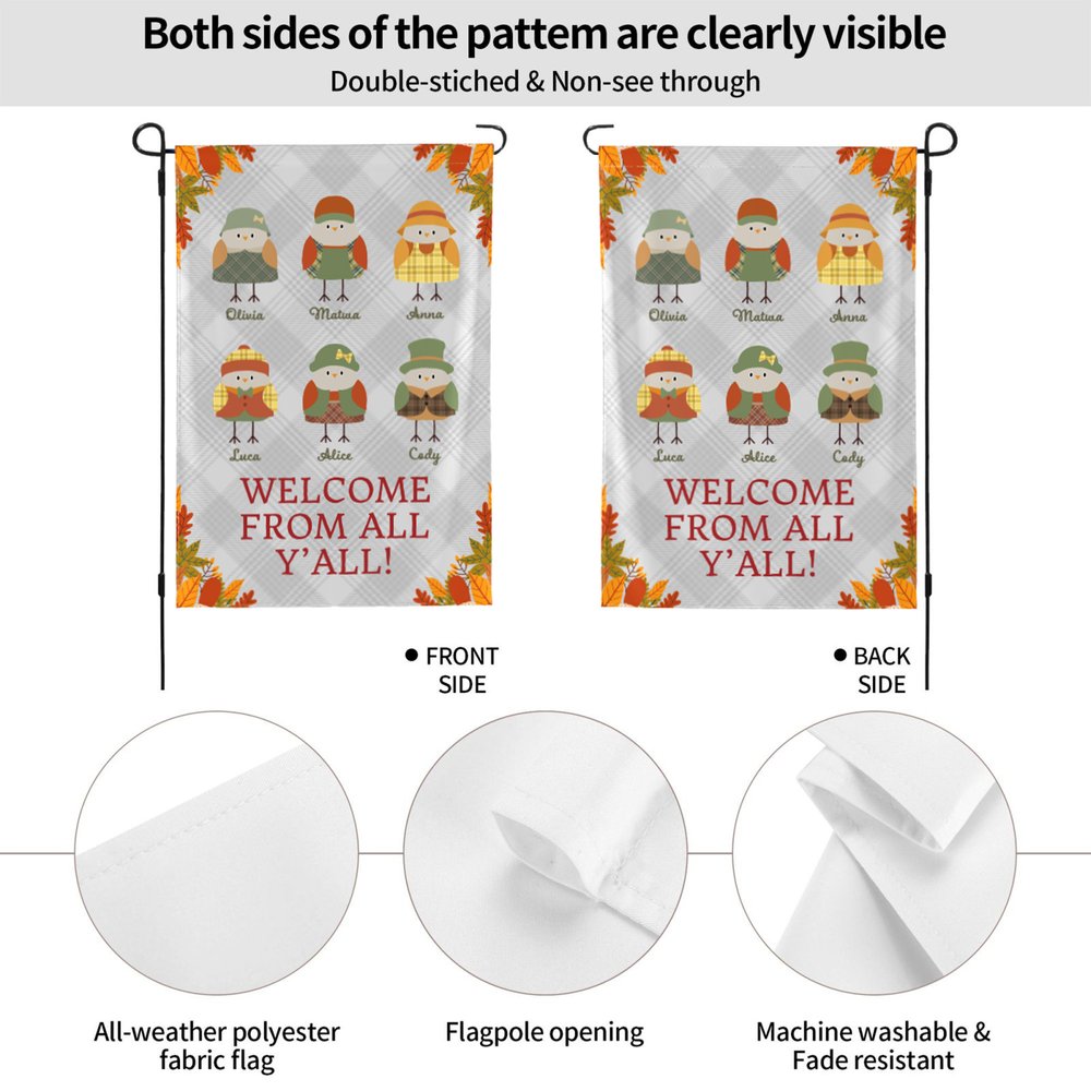 Featuring adorable autumn birds and vibrant leaves, this flag can be customized with 1-12 birds and their corresponding names, seamlessly blending the beauty of nature with personal memories. The vibrant pattern not only adds a finishing touch to outdoor decor but also adds a unique autumn touch to any porch or garden with a custom greeting.