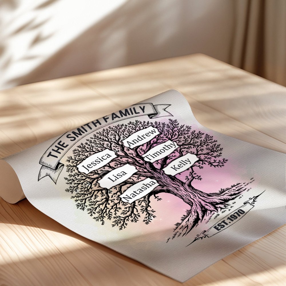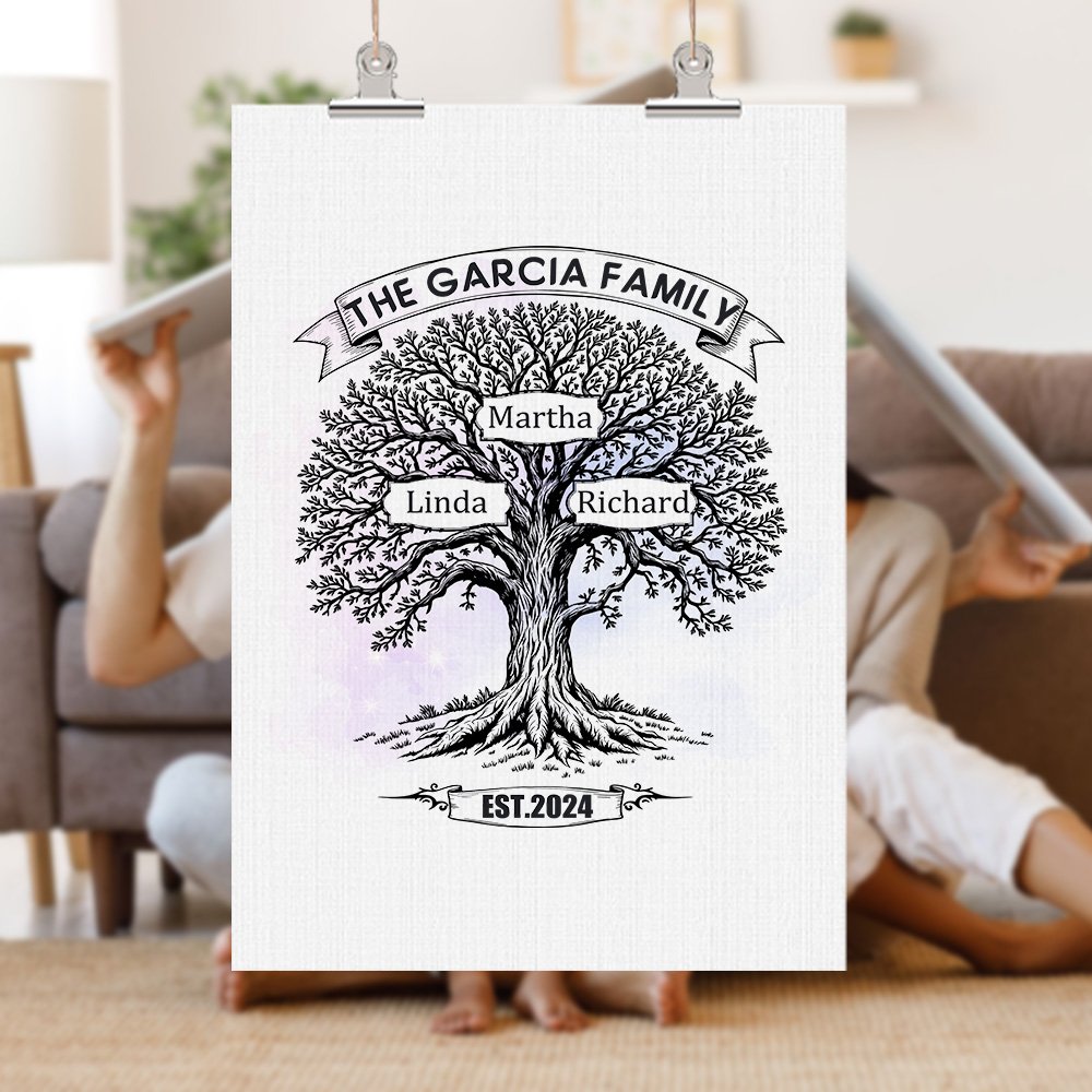 This unique wall art piece carries a unique family story. Our meticulously designed family tree features 1 to 12 names, arranged as fruit, suspended from its branches. The family name at the top and the year of the family's founding at the bottom symbolize unity and the strength of the bloodline.