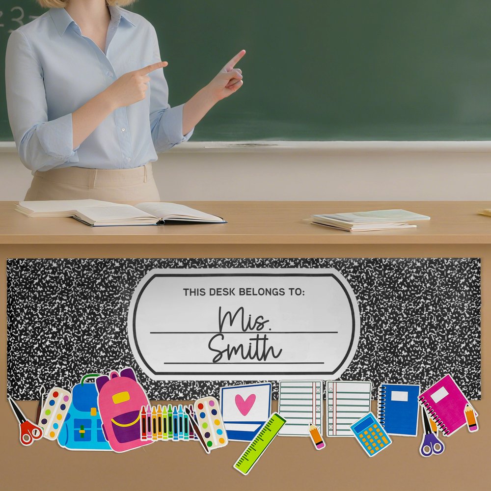 This desk wrap injects vitality into the classroom with a composition notebook-style design. Featuring elements like colorful school supplies and a neat layout, it seamlessly combines the familiar feel of composition notebooks with a playful touch. You can customize the teacher's surname and title, making each desk wrap truly one - of - a - kind and tailored for educators.