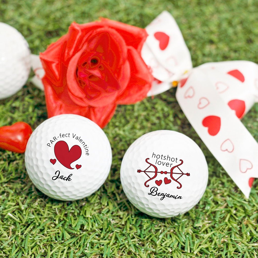 The personalized golf balls feature fun and romantic designs like red lips, hearts, Cupid's arrow, and more, offered in six unique styles. Each ball can be customized with names, transforming an everyday golf accessory into a memorable keepsake. This set of three golf balls provides a perfect blend of functionality and sentiment, adding a personal touch to any round of golf.