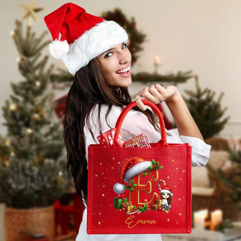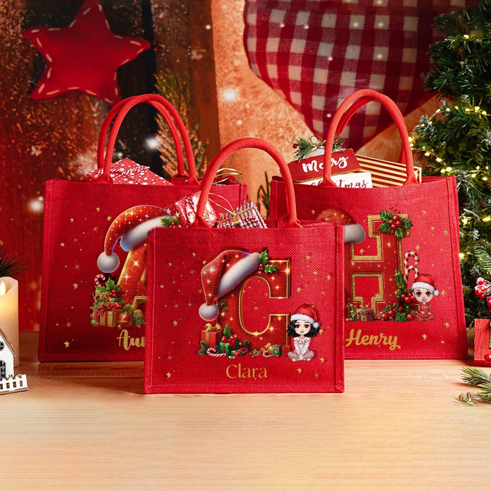 Each tote bag features a charming combination of cartoon characters and Christmas elements. The bags prominently display large, bold initials, making them highly personalized. Surrounding the initials are charming Santa hats, holly leaves, and gift-giving Santa Claus, creating a perfect Christmas-themed look. Red is ideal for embracing the Christmas spirit; this tote bag will brighten up any celebration.