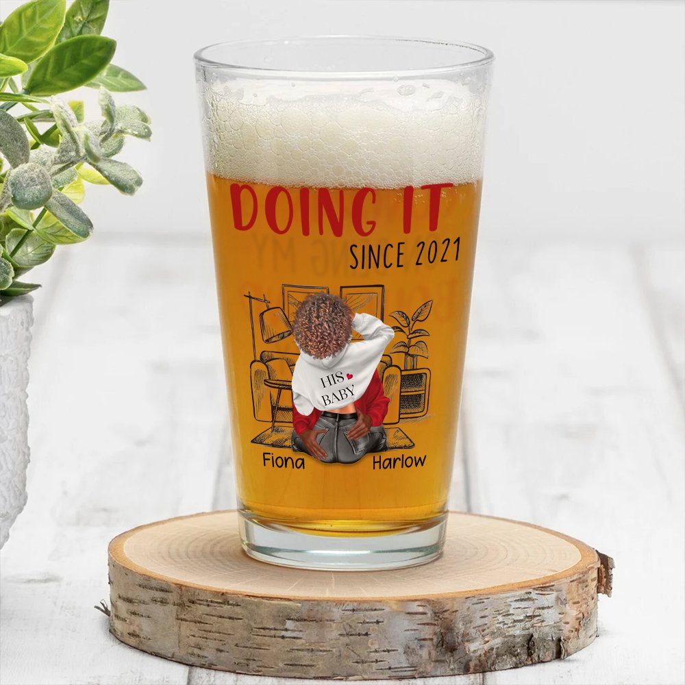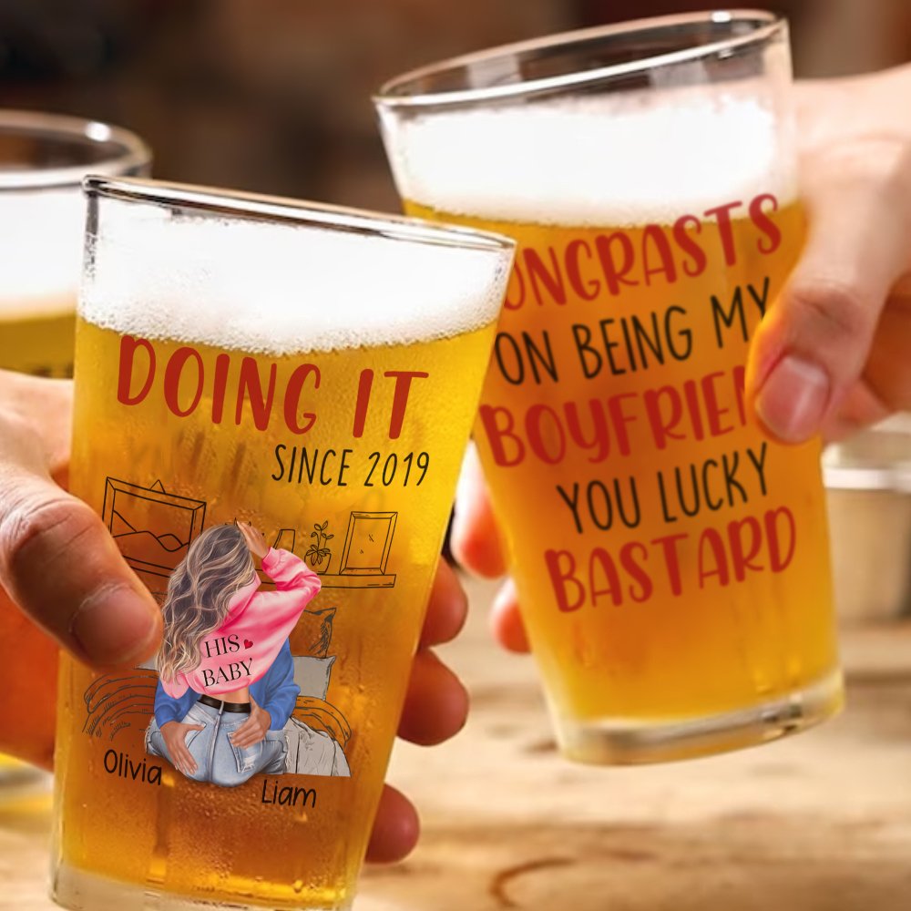 This beer glass has designs on both sides. One side is a sweet and romantic hugging couple with different backgrounds. You can customize your names and years. The other side is the affectionate copywriting of "Congratulations on being mine...you lucky bastard," showing the beautiful love between you.