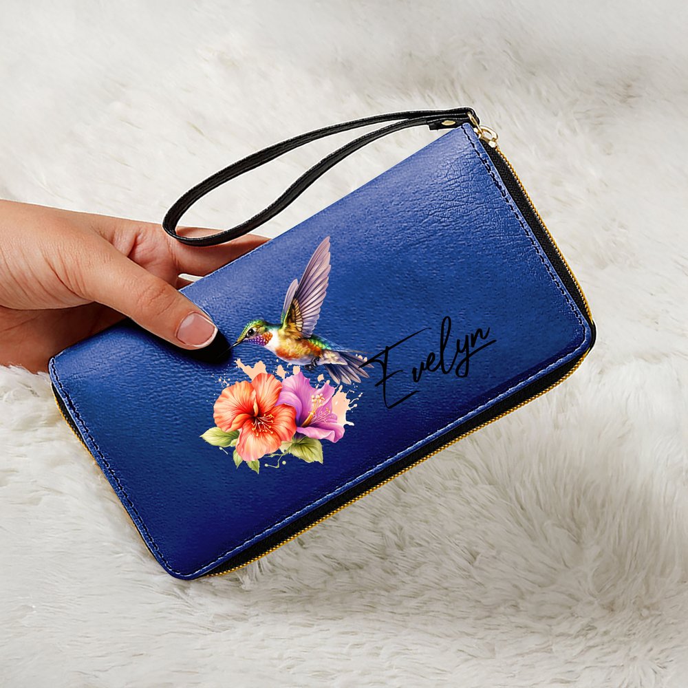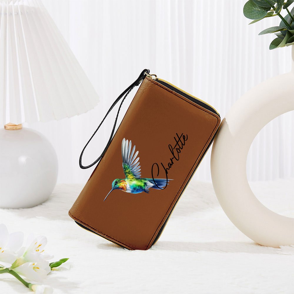 The wallet features a beautiful UV-printed pattern featuring a vibrant hummingbird and a custom name. The overall design is fresh and dynamic, combining natural beauty with a stylish touch. It highlights the wearer's elegant taste, avoids monotony, and adds a touch of sophistication to any everyday outfit.