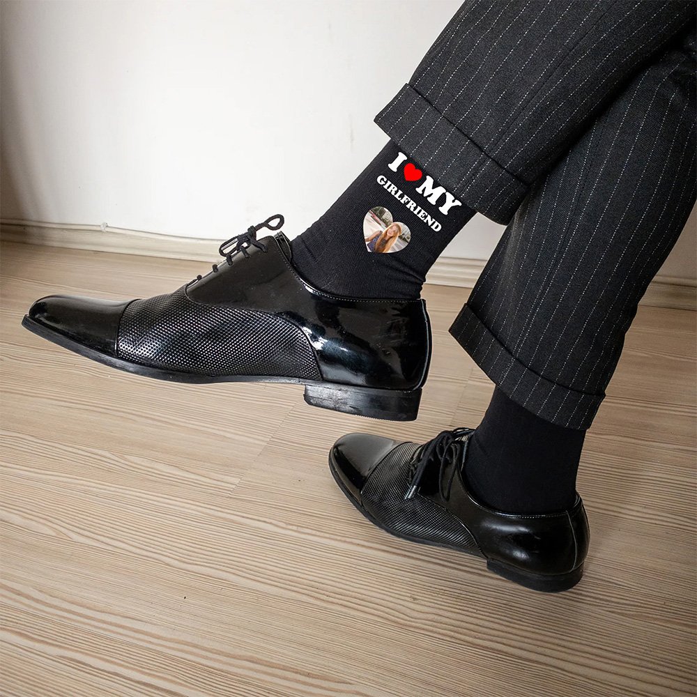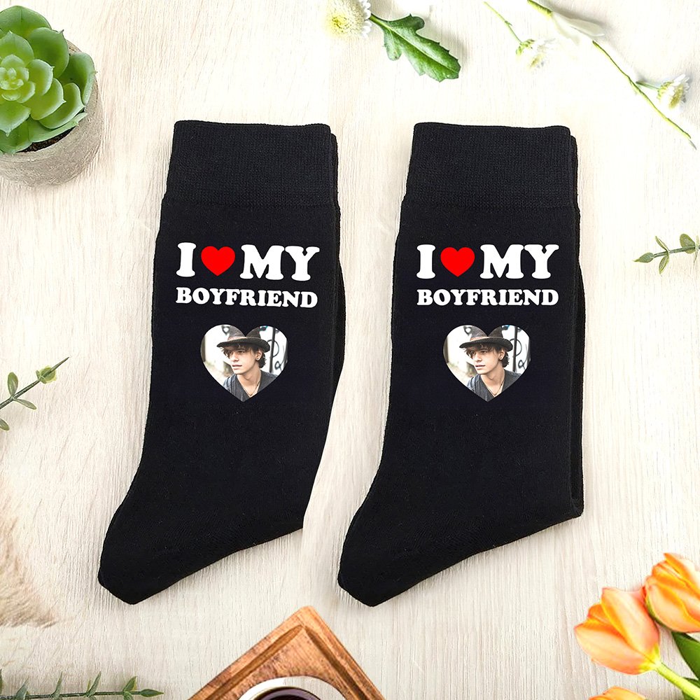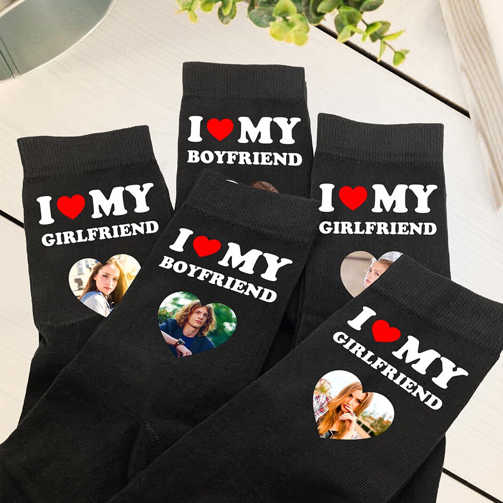 These black socks feature a simple slogan design with two captions, "I love my boyfriend" and "I love my girlfriend", and incorporate a personalized photo design. Upload a photo of you or your significant other into the love frame, which is full of fun and personality and reflects your love.