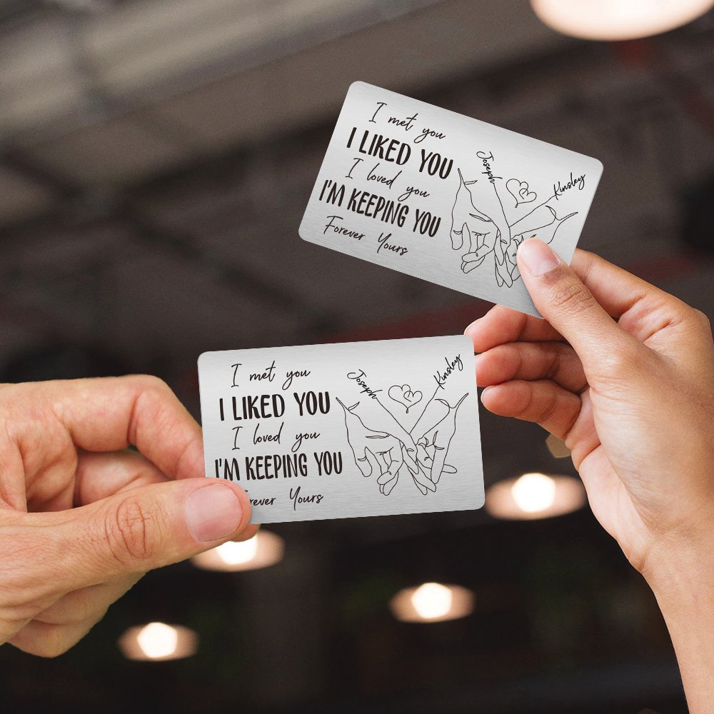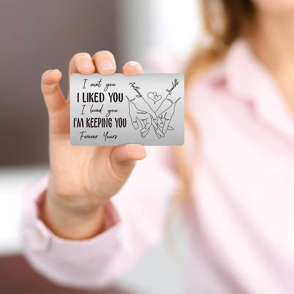 It is a very memorable gift, especially suitable for special memories between couples. The card design is simple and elegant, printed with affectionate words and hand-painted style couple holding hands, conveying deep love and commitment to each other, and the touching words printed on the card: "I met you. I liked you. I loved you. I'm keeping you. Forever Yours." expresses the deep affection and commitment to the other half. Users can customize the couple's name on the card to make it more unique and memorable.