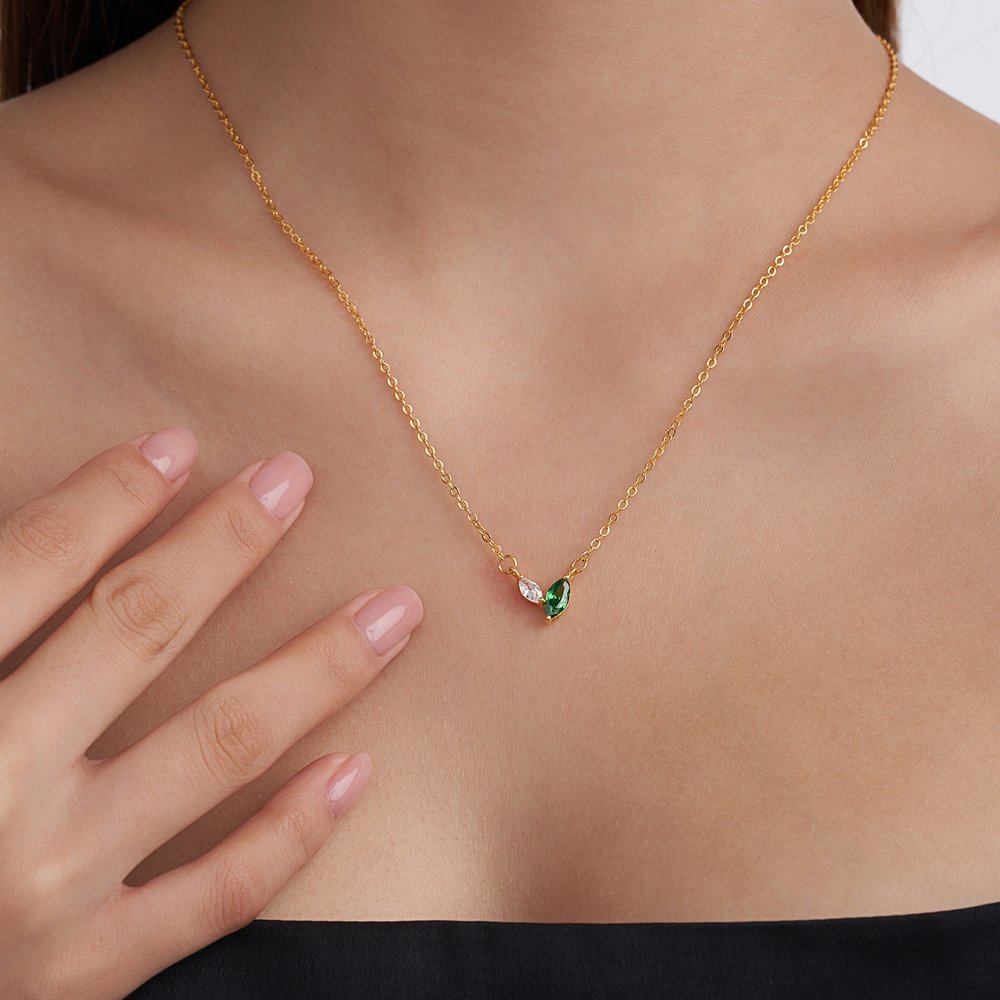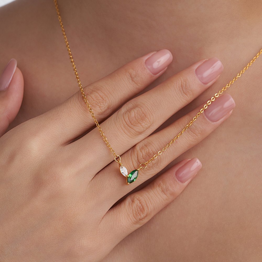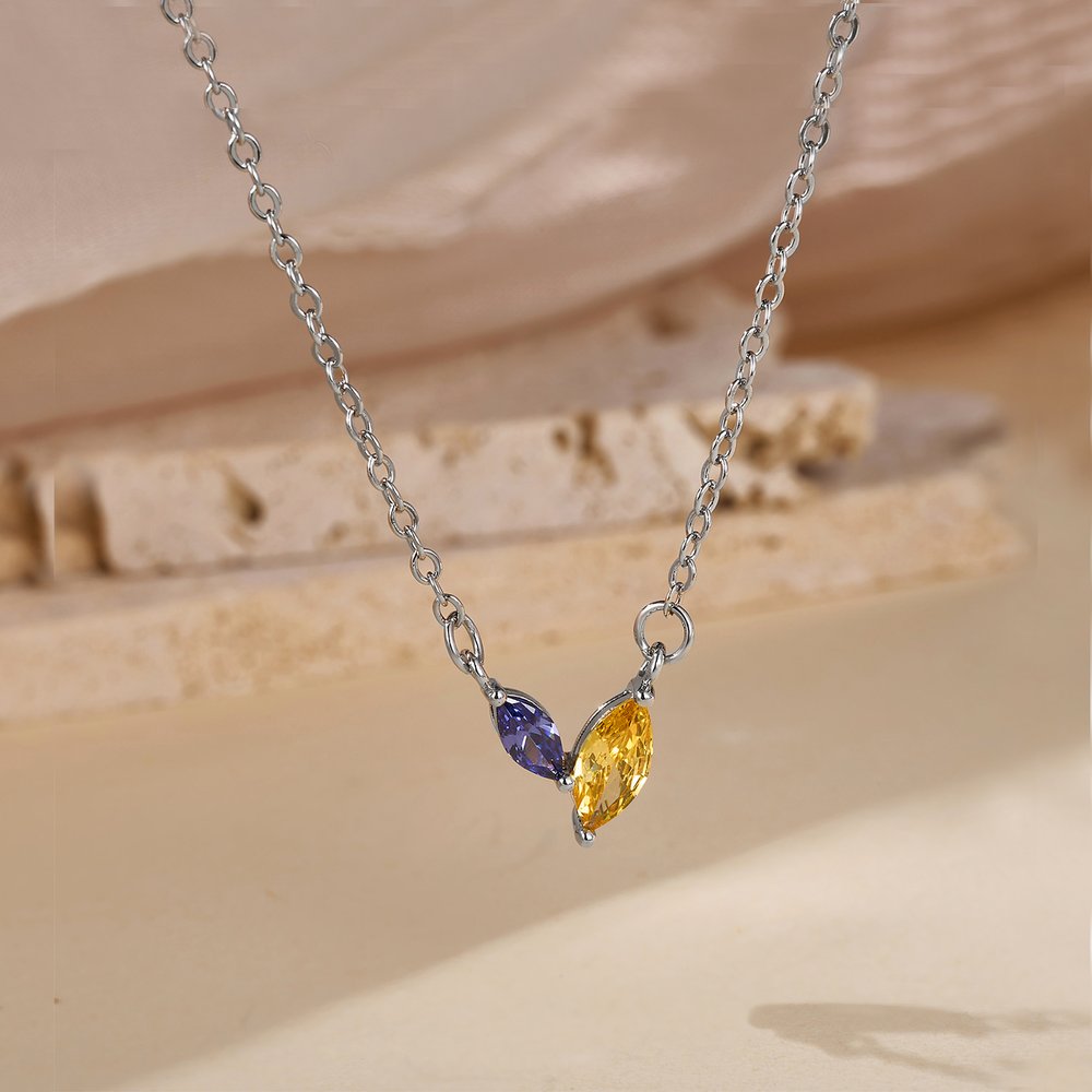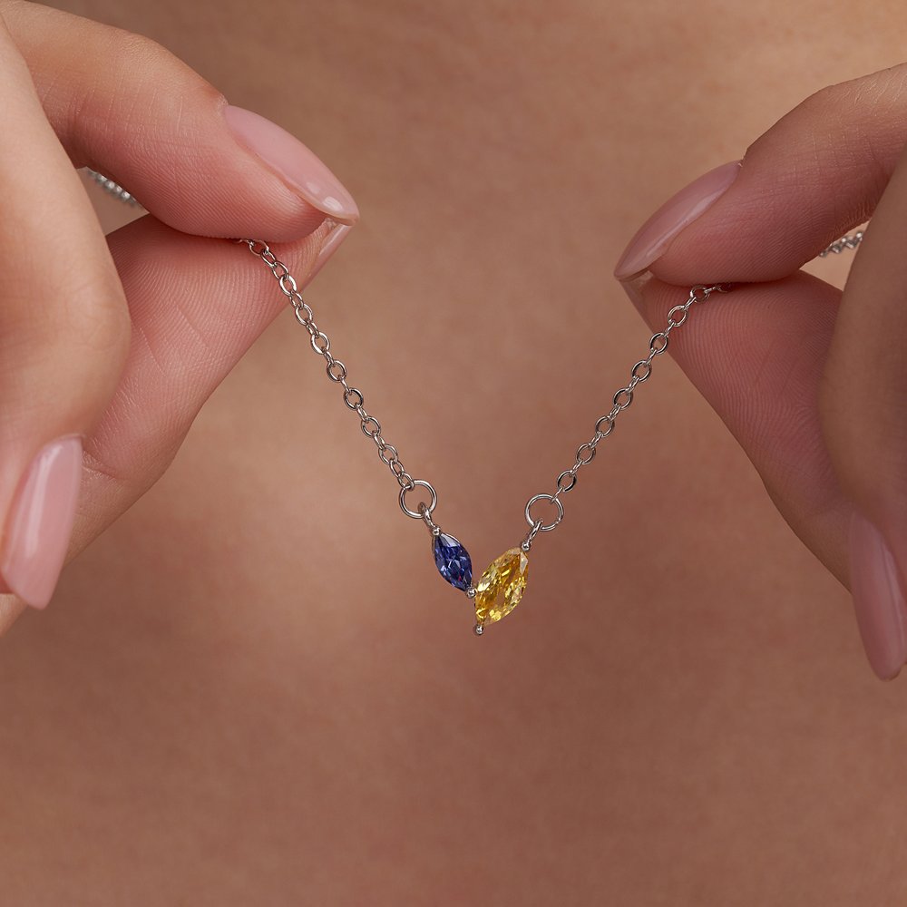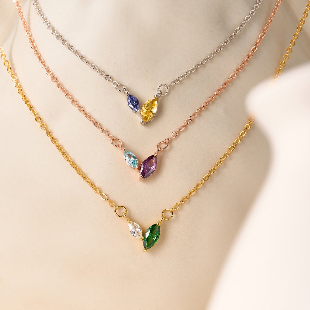This necklace features distinctive marquise birthstones as its centerpiece. Customize it with two birthstones of personal significance, seamlessly integrating these symbolic elements into the design. It not only creates a one-of-a-kind piece that reflects your individuality but also conveys cherished emotions with profound sentimental value.