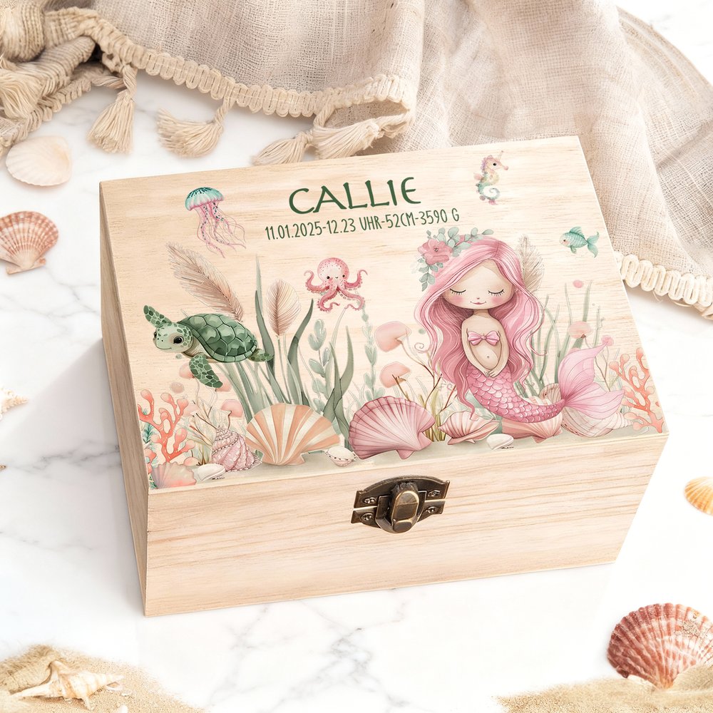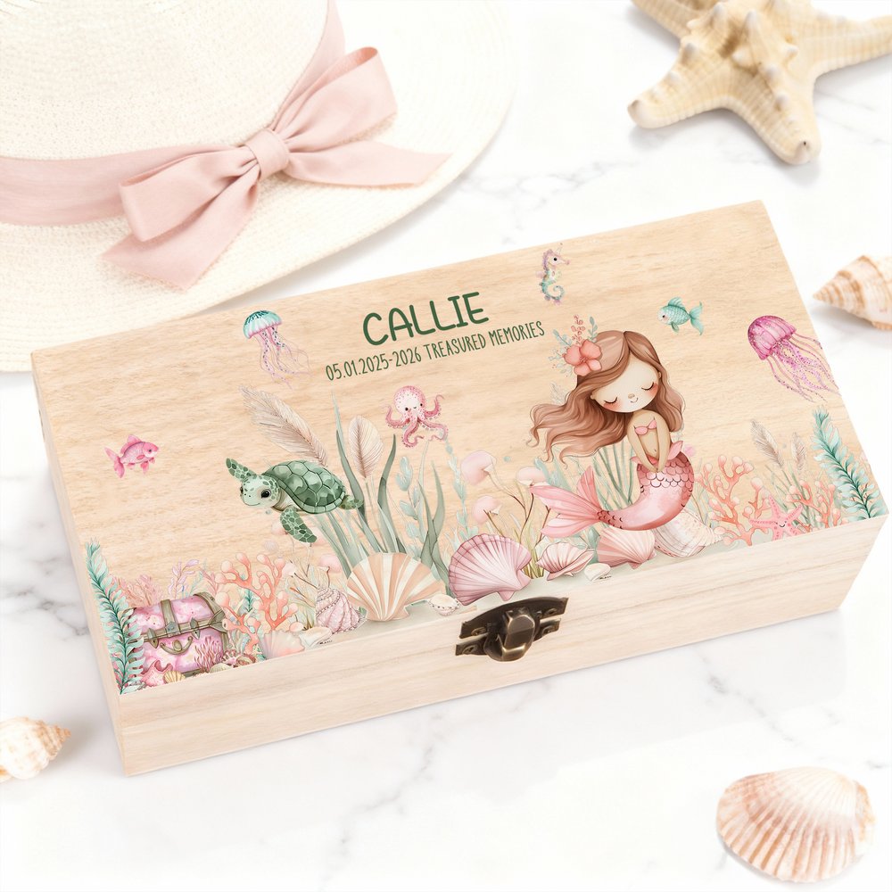 Personalized Mermaid Ocean Animals Wooden Memory Storage Box with Name and Text Birthday Baby Shower Gift for Newborn Parent