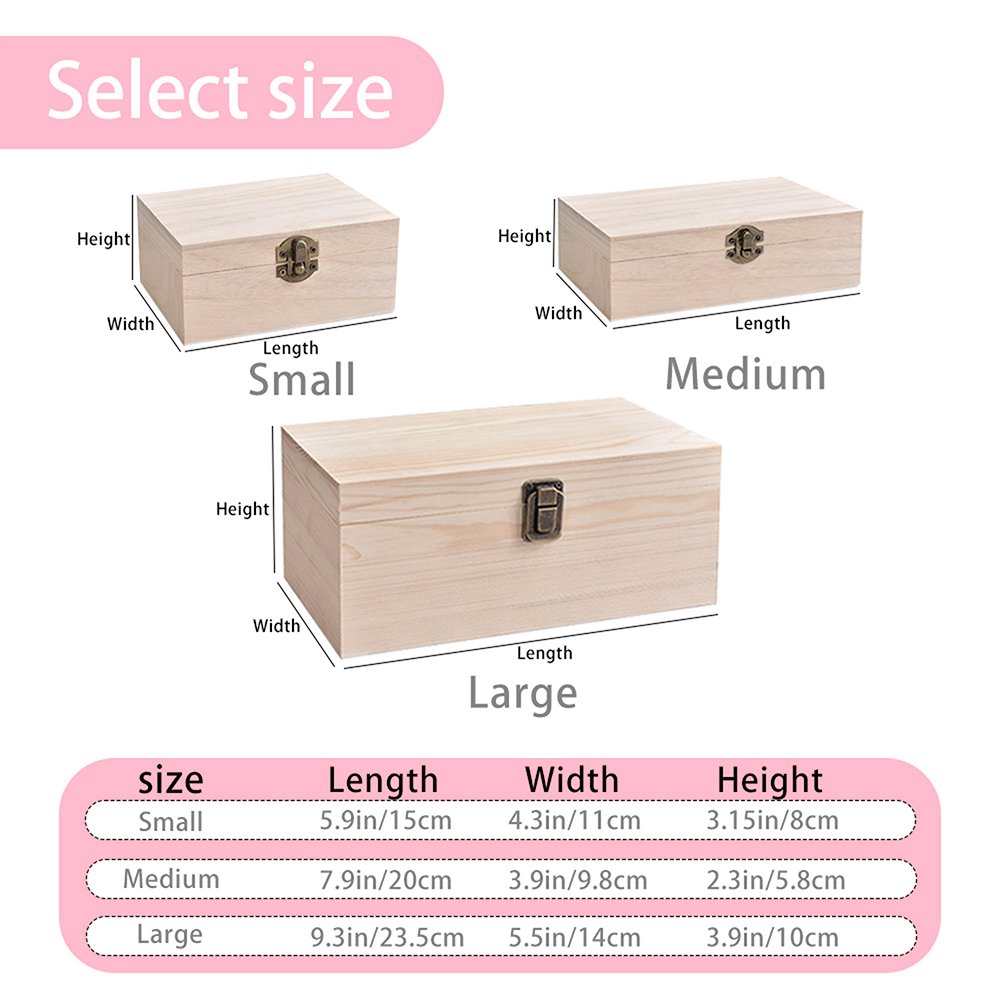 Material: Small Box - Paulownia Wood Medium Box - Wood Large Box - Pine Wood Buckle - Metal