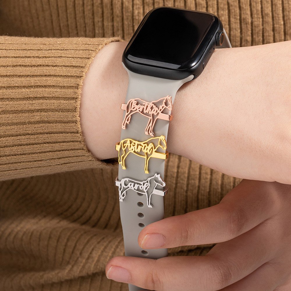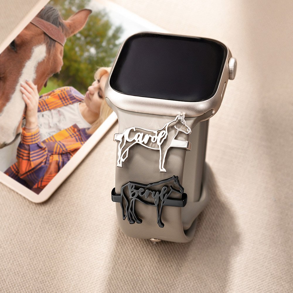Elevate your watch band with a custom horse silhouette charm. This charming accessory features a detailed silhouette of your beloved horse’s face, paired with their name in stylish script. Choose from a variety of vibrant strap colors to match your style, creating a harmonious look that reflects your personality and passion. It’s not just a decorative piece but a perfect expression for your horse, making your watch strap truly one of a kind.