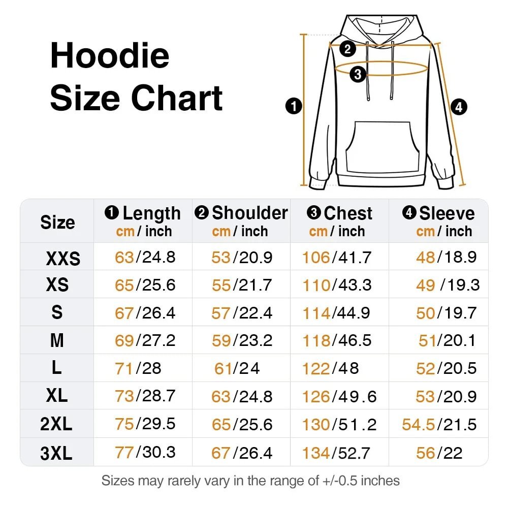 Measurement: T-shirt - XXS, XS, S, M, L, XL, XXL, 3XL, 4XL, 5XL Sweatshirt - XXS, XS, S, M, L, XL, 2XL, 3XL Hoodie - XXS, XS, S, M, L, XL, 2L, 3XL