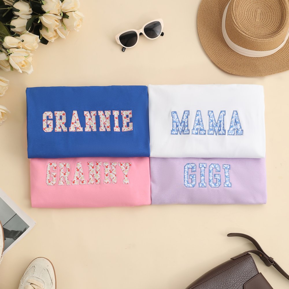 Personalized Multicolor Appliqué Flower Soft T-shirt Sweatshirt Hoodie with Embroidered Name Mother's Day Birthday Christmas Gift Mom Grandma